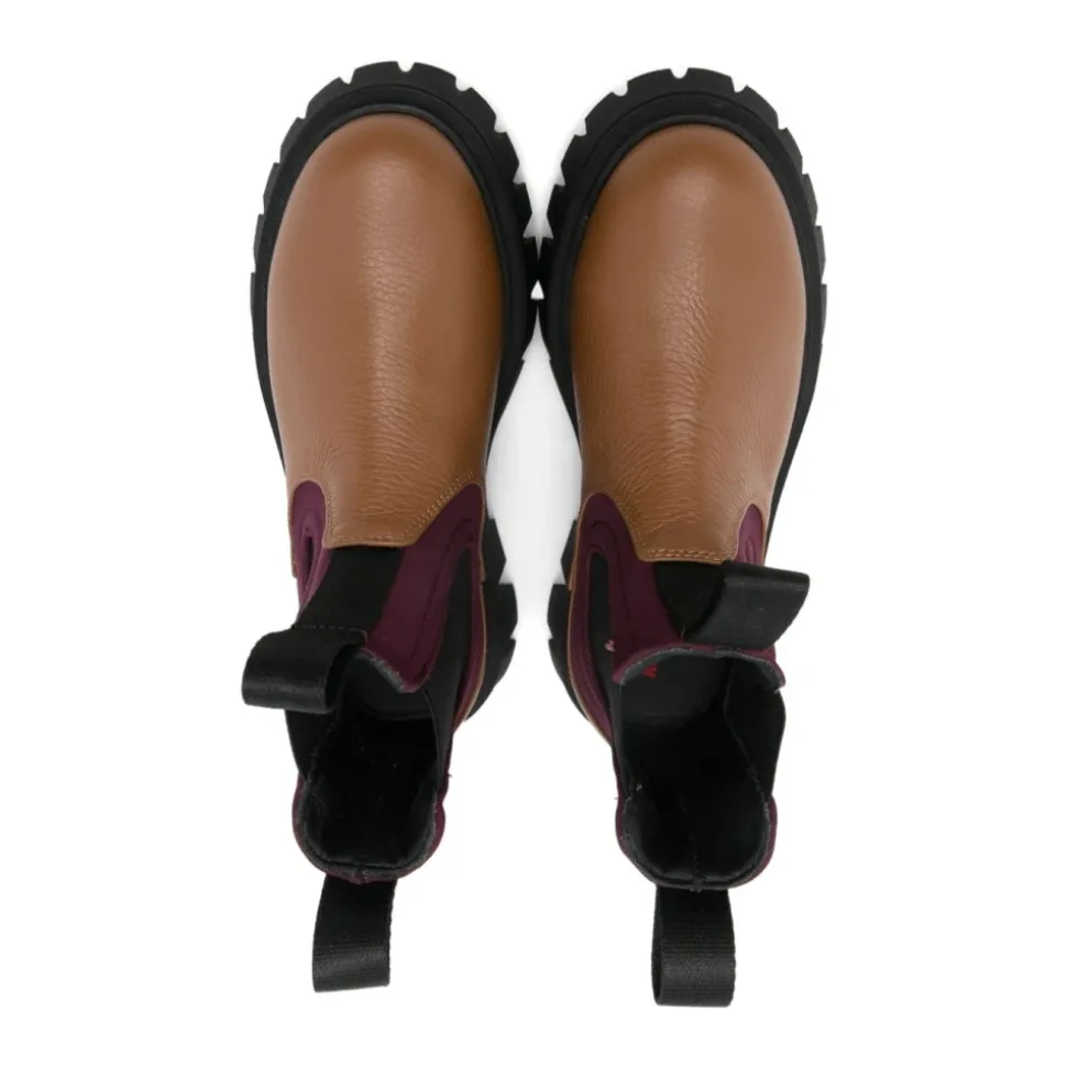 Marni leren enkelboots combineren een grove profielzool met elastische inzetstukken aan de zijkant voor gemakkelijk aan- en uittrekken. Hun silhouet met ronde neus en enkelhoogte is gebouwd voor dagelijks gebruik en grip. Belangrijkste kenmerken: Beige | Leer en textiel | Rubberen profielzool | Dubbele treklipsluiting | Elastische inzetstukken aan de zijkant voor gemakkelijke instap | Enkelhoogte | Ronde neus | Grove profielzool | Samenstelling & verzorging: Voering: kalfsleer 100% | Buitenkant: textiel 100%, kalfsleer 100% | Zool: rubber 100%