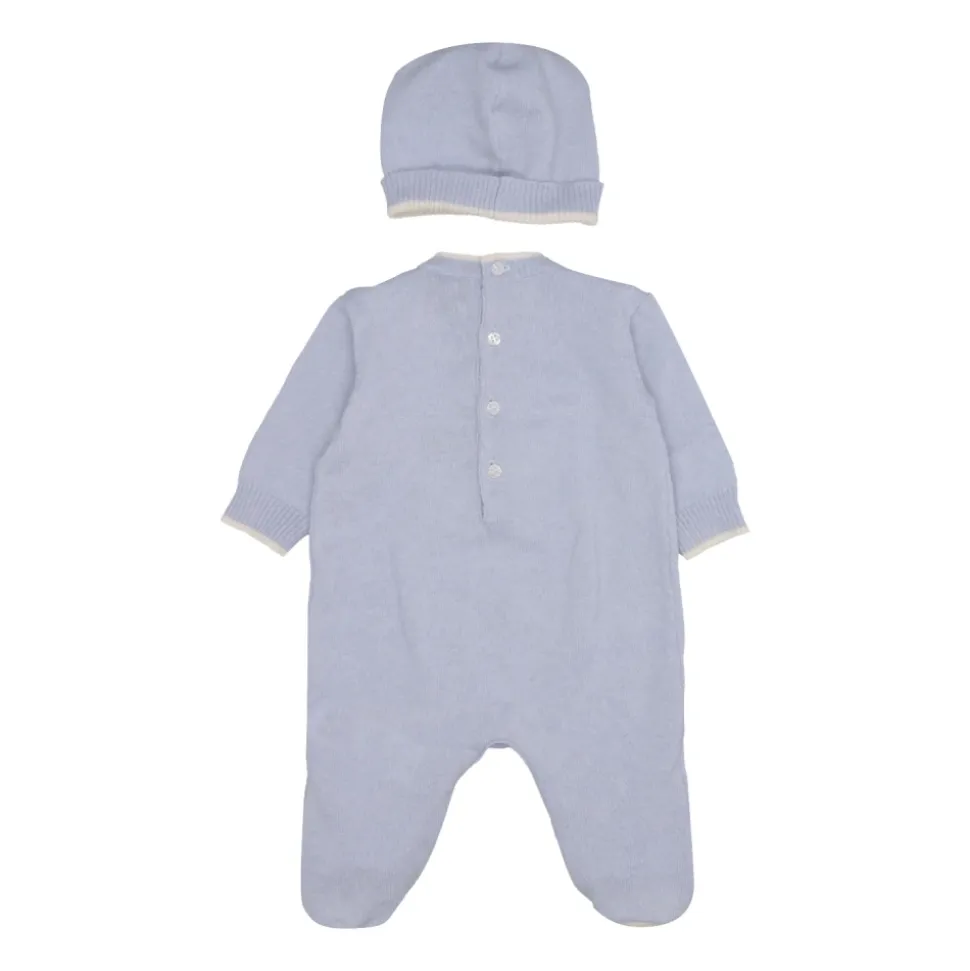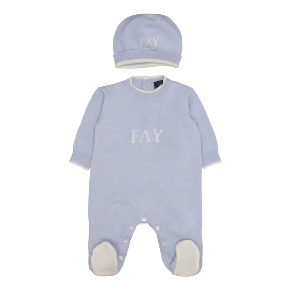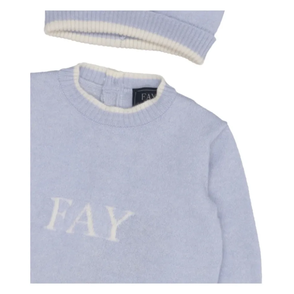 Kleed je kleine heer stijlvol aan met deze Fay set van wol en kasjmier. De set bestaat uit een tuinbroek met een ronde hals, lange mouwen met geribbelde manchetten, knoopsluiting aan de achterkant, teendekking, en contrasterende kleuraccenten. De set wordt geleverd met een muts met geribbelde revers en het Fay-logo aan de voorkant. Perfect voor een reguliere pasvorm.
