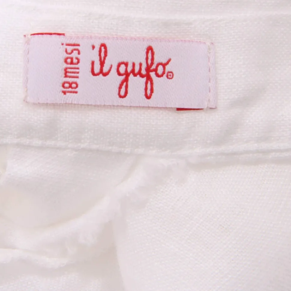 Verrijk de stijl van je kleine meisje met deze Il Gufo set uit Italië. Gemaakt van 100% linnen, het bevat een wit t-shirt en grijs-wit gestreepte shorts.