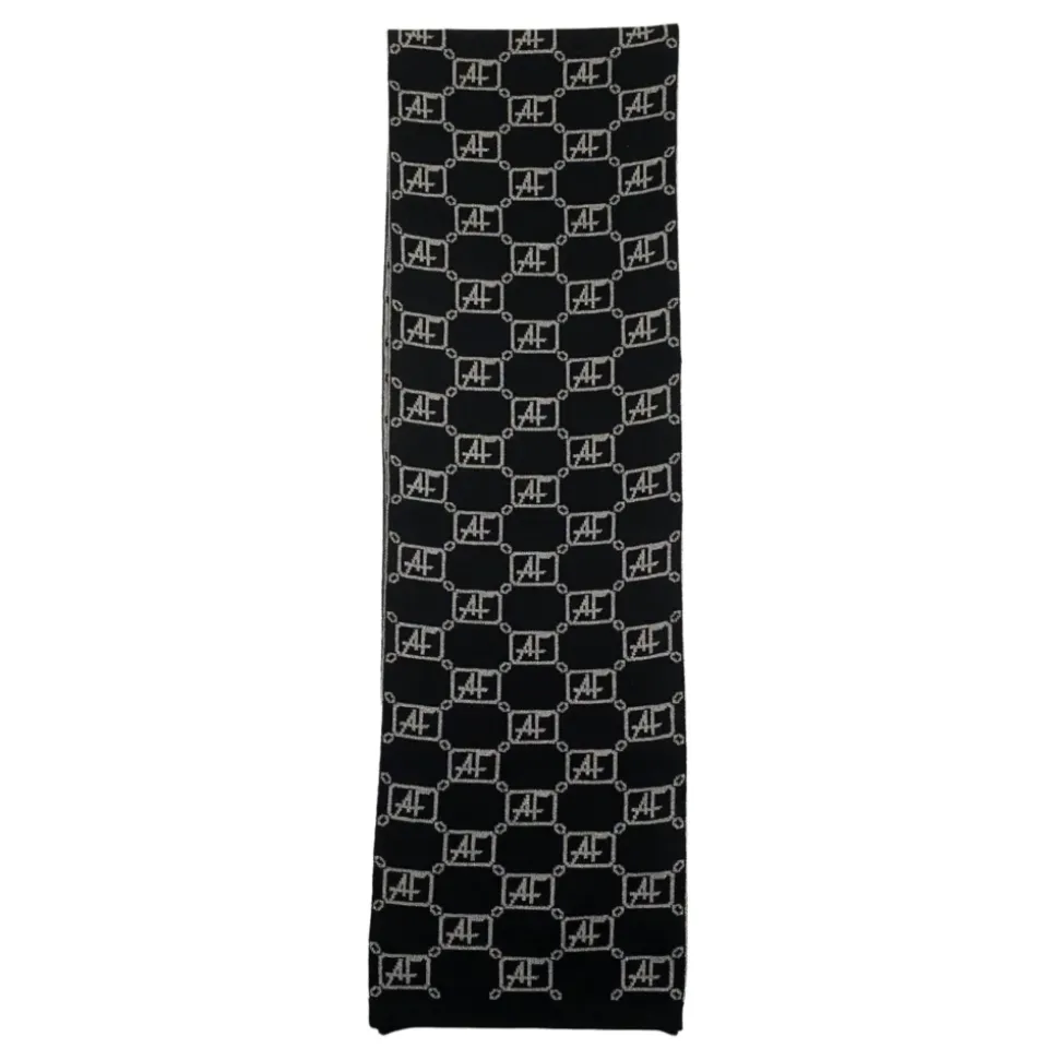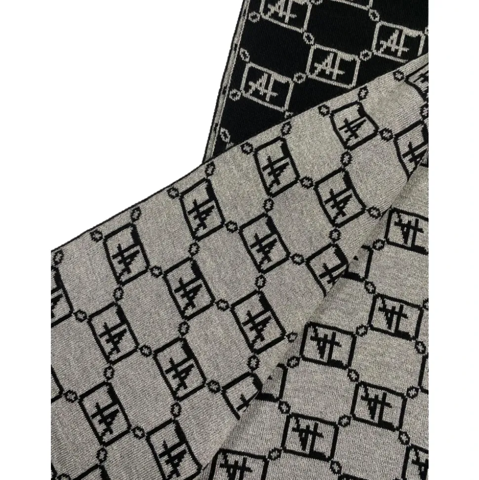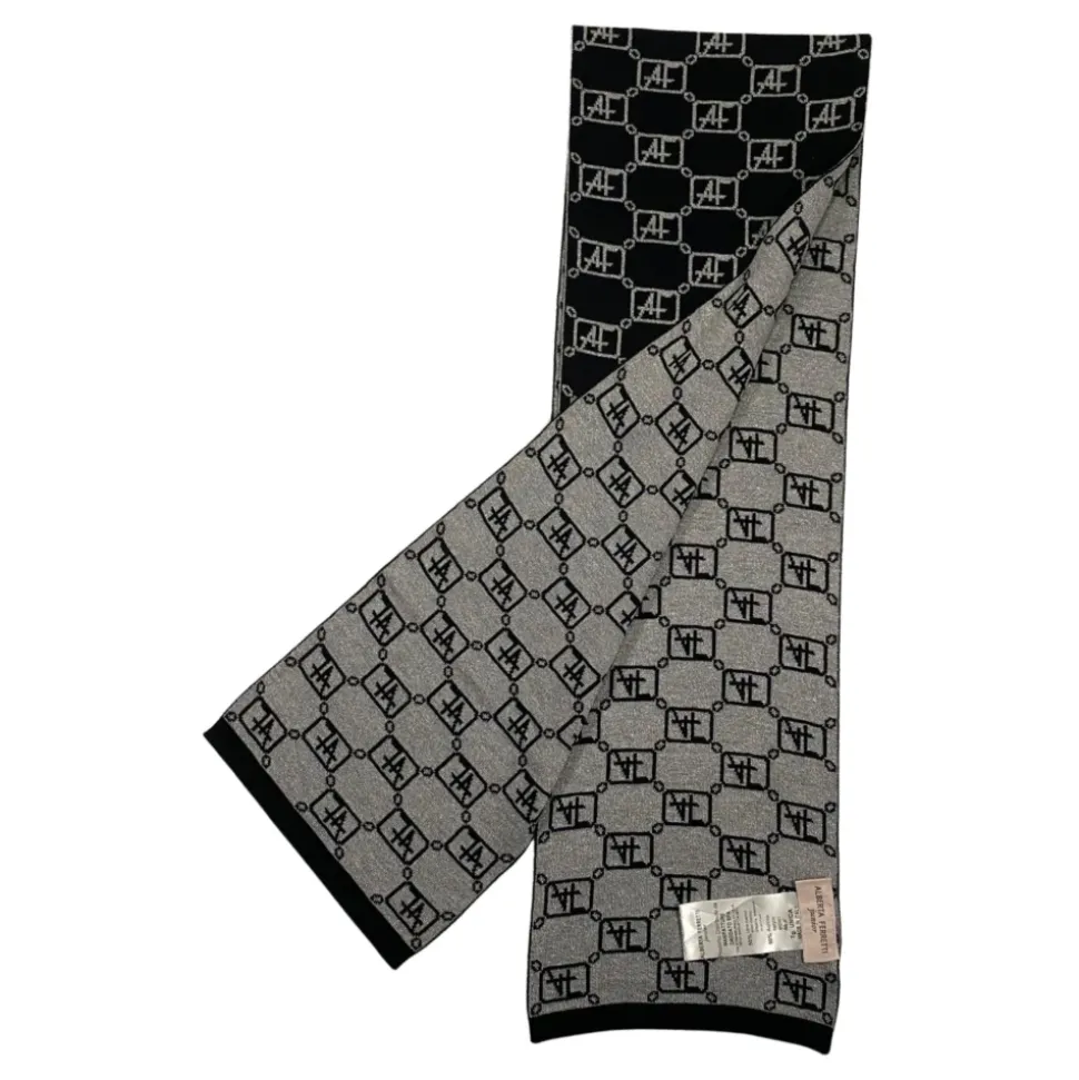 Alberta Ferretti Logo Gebreide Sjaal – een rechthoekige gebreide sjaal met een all-over logo voor een stijlvolle alledaagse laagjeslook. Belangrijkste kenmerken: Zwart | Zilver | Wol | Volledig gebreid | All-over logopatroon | Rechthoekig ontwerp | Samenstelling & verzorging: 50% wol | 50% acryl