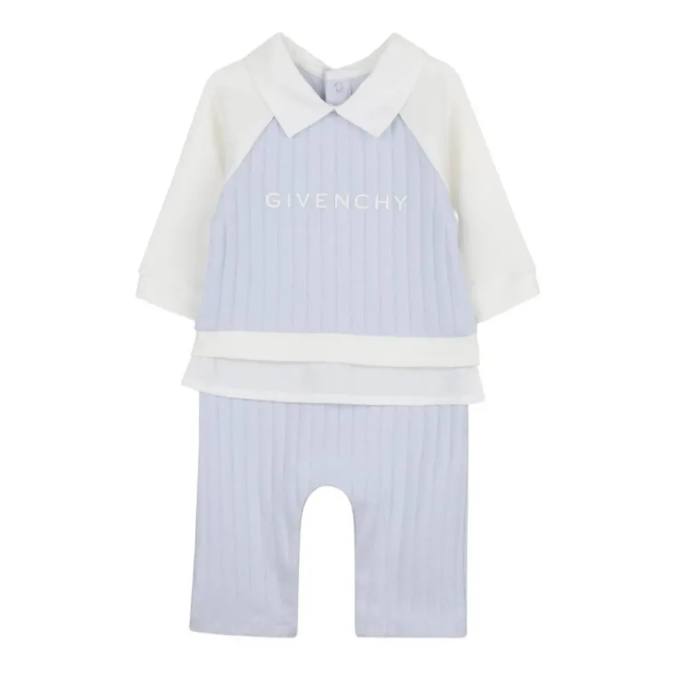 De Givenchy Logo Romper is een romper met lange mouwen en een puntige kraag, met een knoopsluiting aan de achterkant, afgewerkt met een prominent logo detail voor directe merkherkenning. Belangrijkste kenmerken: Blauw | Helderblauw | Knoopsluiting achter | Puntige kraag | Lange mouwen | Logo print | Knoopsluiting achter