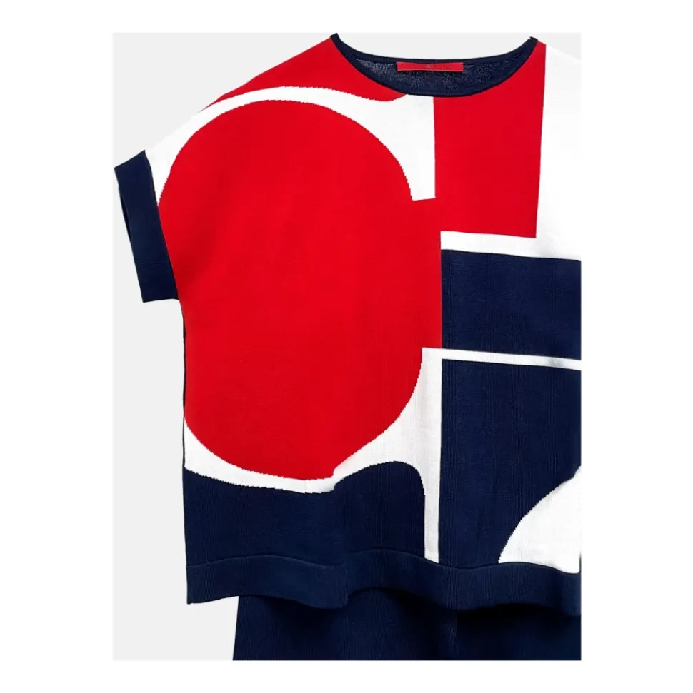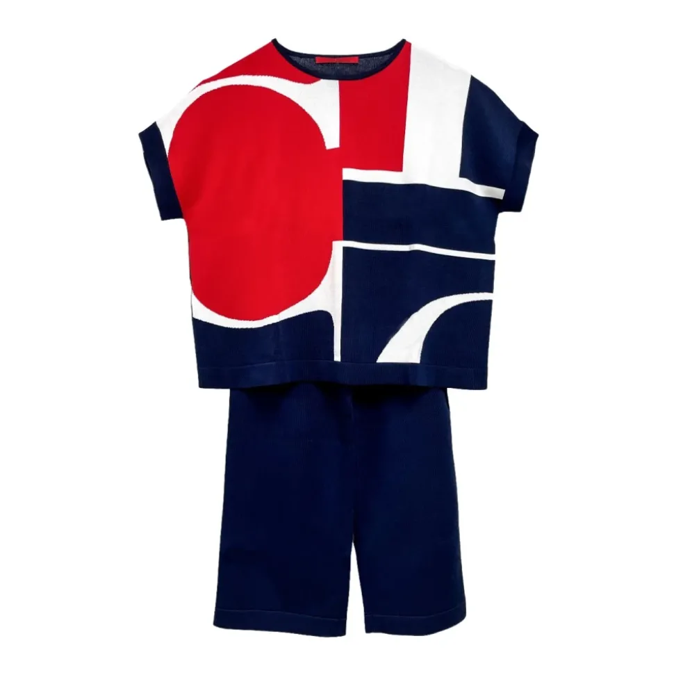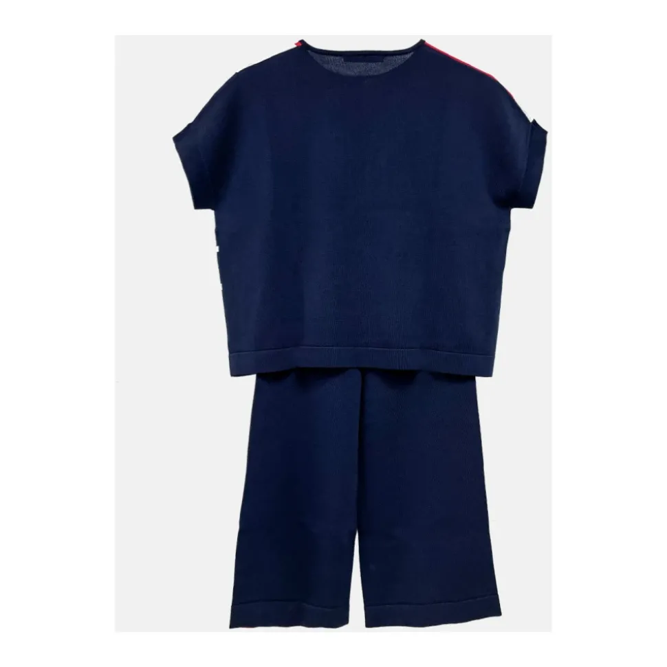 De Carolina Herrera Marineblauwe Gebreide Set biedt een stijlvol en comfortabel ensemble bestaande uit een marineblauwe broek en een trui versierd met de initialen van het merk in rood, wit en marineblauw. Perfect voor een chique en gezellige look. Belangrijkste kenmerken: Marineblauw | Rood | Wit | Katoen | Ronde hals | Korte mouwen | Samenstelling en onderhoud: 100% Katoen | Machinewas koud, droogtrommel laag.