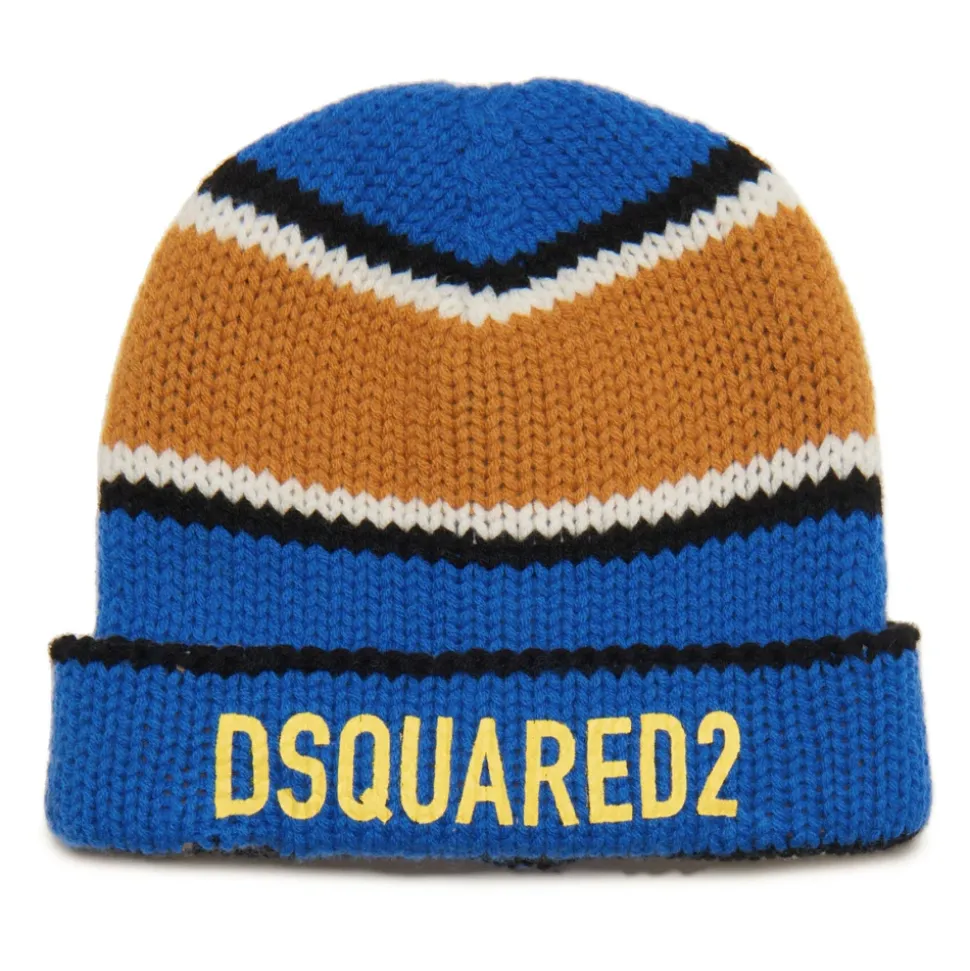 Blijf warm en stijlvol met deze meerkleurige wollen beanie van Dsquared2. Met een contrasterend kleurenlogo op de voorkant, is dit casual accessoire perfect voor alledaagse outfits en minder formele gelegenheden. Belangrijkste kenmerken: Princess Blue | Blauw | Meerkleurig | 100% Wol | Contrasterend kleurenlogo | Horizontaal streepmotief | Omgeslagen rand | Ronde kroon | Pull-on model | Afmetingen en pasvorm: Verkrijgbaar in drie maten | Samenstelling en onderhoud: 100% Wol