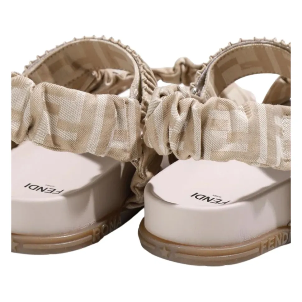 Maak kennis met de Fendi Monogram Kinder Sandalen, vervaardigd met een stijlvolle combinatie van stof en leer voor dagelijks comfort en stijl. Belangrijkste kenmerken: Beige | Stof | Leer | Klittenbandsluiting | Monogrampatroon |