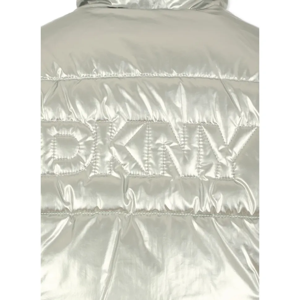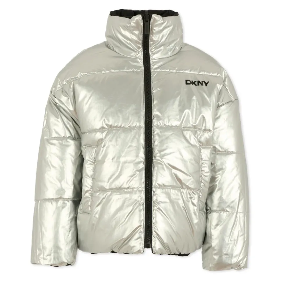 Blijf warm en stijlvol met deze omkeerbare zwarte en zilveren DKNY winterjas voor kinderen. Voorzien van een verborgen capuchon, ritssluiting aan de voorkant en zijzakken. Deze zware gewatteerde en doorgestikte jas is perfect voor koud weer. Versierd met een logo op de borst aan de ene kant en een geborduurd logo op de rug aan de andere kant. Gemaakt van 100% polyamide. Machinewasbaar op 30°C.