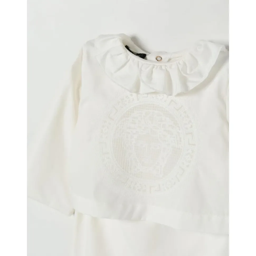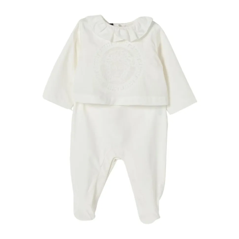 Kleed je kleine meisje in stijl met deze schattige Versace babyromper. Gemaakt van 100% katoen, is deze zachte romper met voetjes ontworpen voor comfort en versierd met prachtige details, waardoor het een charmante outfit is voor je kleintje.