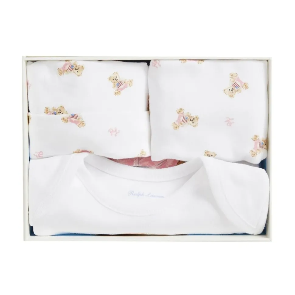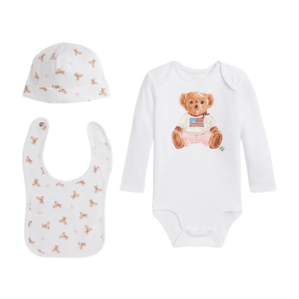 De Polo Ralph Lauren Polo Bear Onesie Set combineert een onesie met drukknoopsluiting met een bijpassende slab en muts, geaccentueerd door contrasterende Polo Bear- en monogramprints voor dagelijks gebruik. Belangrijkste kenmerken: Wit | Katoen | Drukknoopsluiting aan de onderkant (onesie) | Drukknoopsluiting aan de achterkant (slab) | Jersey voering (muts) | Ronde hals | Lange mouwen | Contrasterende Polo Bear-print op de voorkant | Monogramlogo en Polo Bear all-over print (slab en muts) | Rechte zoom met omslag (muts) | Samenstelling & onderhoud: 100% katoen
