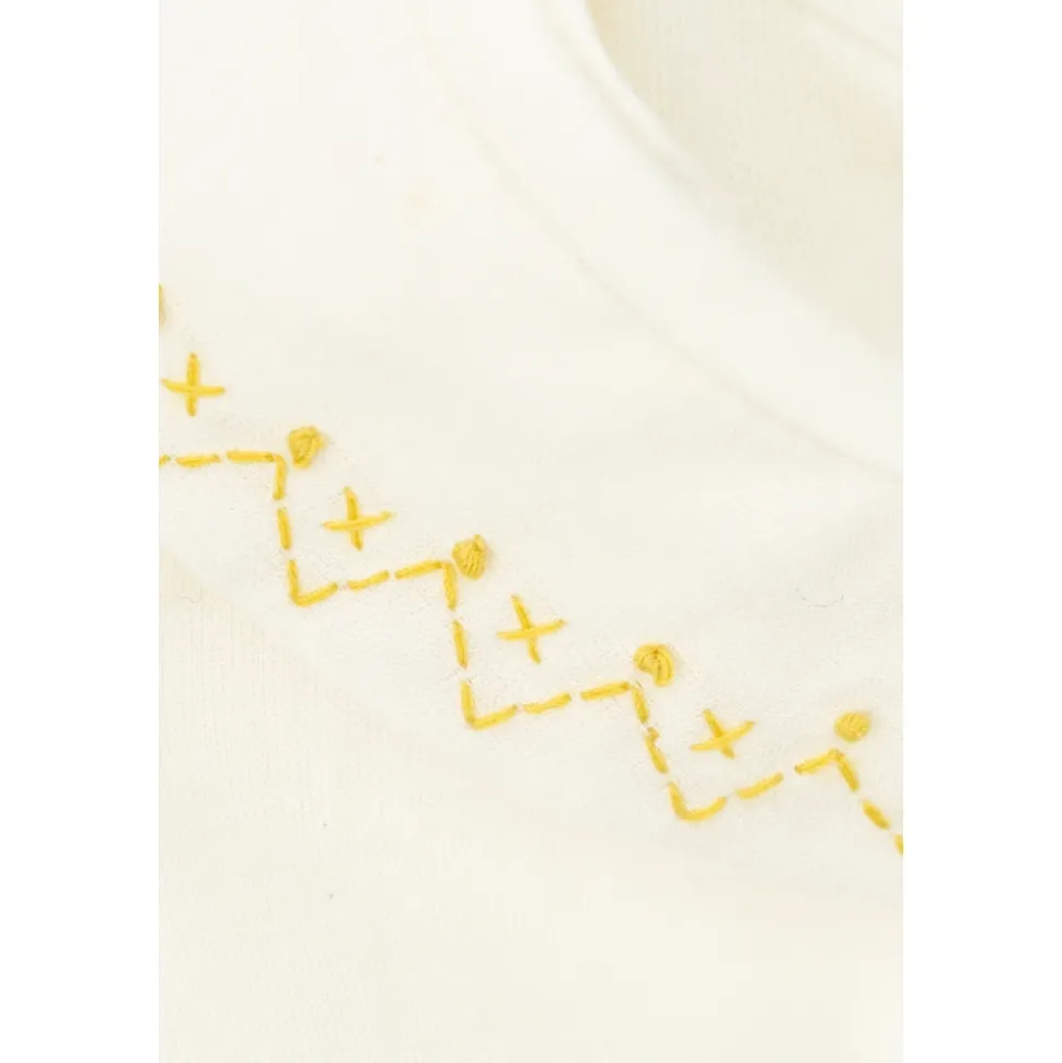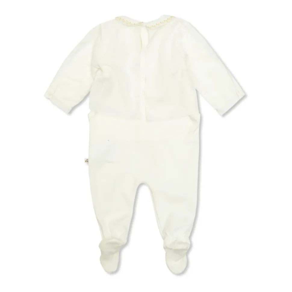 Hier is de “SAGE” PYJAMA van het gerenommeerde Franse merk Bonpoint, synoniem voor klassieke elegantie en verfijnde stijl. Gemaakt van de hoogste kwaliteit katoen, biedt het buitengewone zachtheid en comfort voor de delicate huid van een baby. De set bestaat uit een crèmekleurige top met lange mouwen en broek geïntegreerd met voetjes, wat zorgt voor volledige bewegingsvrijheid. Decoratieve gele borduursels in een zigzagpatroon met kruisen op de kraag voegen subtiele charme toe. Er is een praktische knoopsluiting aan de achterkant van de top, en extra drukknopen in het kruis vergemakkelijken dagelijks gebruik. Het logo in de vorm van twee bruine kersen op het zijlabel benadrukt het prestigieuze karakter van het ontwerp. WAAROM DIT PRODUCT KOPEN? * Gemaakt van de hoogste kwaliteit katoen, vriendelijk voor de huid van het kind. * Elegant en comfortabel ontwerp ideaal voor baby’s. * Unieke details zoals decoratieve borduursels en geïntegreerde voetjes. * Prestigieus Bonpoint-merk, bekend om luxe kinderkleding.