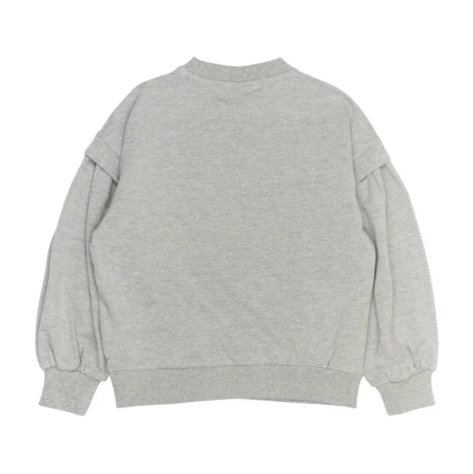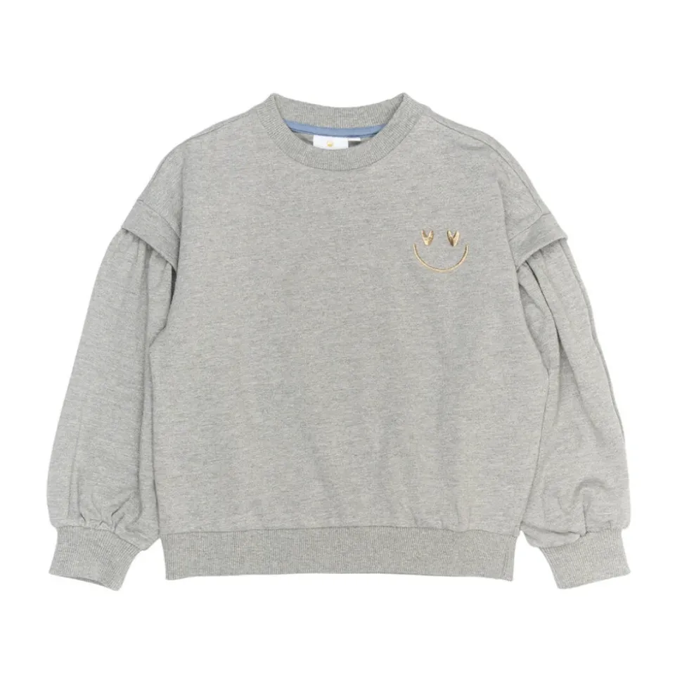 DE NIEUWE Renata Glitter Sweatshirt is een relaxed, met glitteraccenten versierd sweatshirt met opvallende ballonmouwen. Het combineert een zachte katoenen constructie met gelaagde schouderdetails en een kleine geborduurde smiley voor dagelijks gebruik. Belangrijkste kenmerken: Grijs | Licht grijs | Katoen | Geribbelde manchetten en zoom | Ballonmouwen | Gelaagd schouderdetail | Kleine geborduurde smiley met gouden hartjesogen | Glitter afwerking | Afmetingen en pasvorm: Relaxte pasvorm
