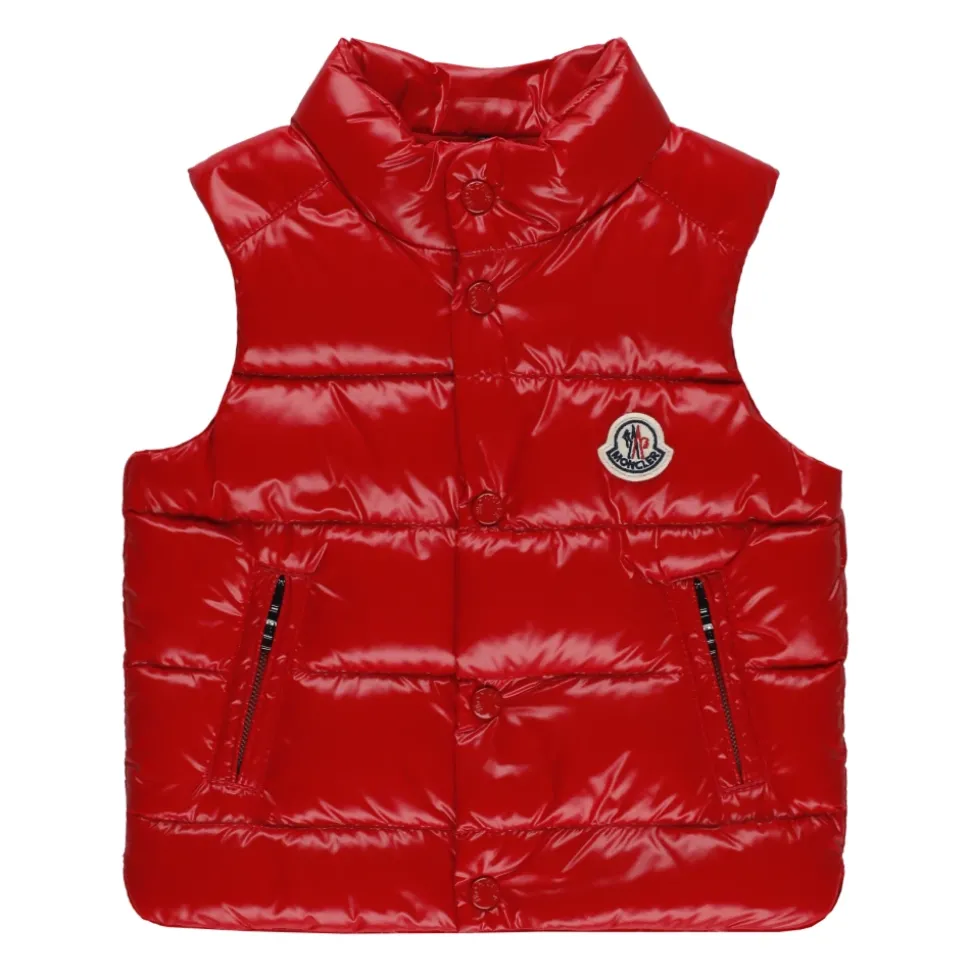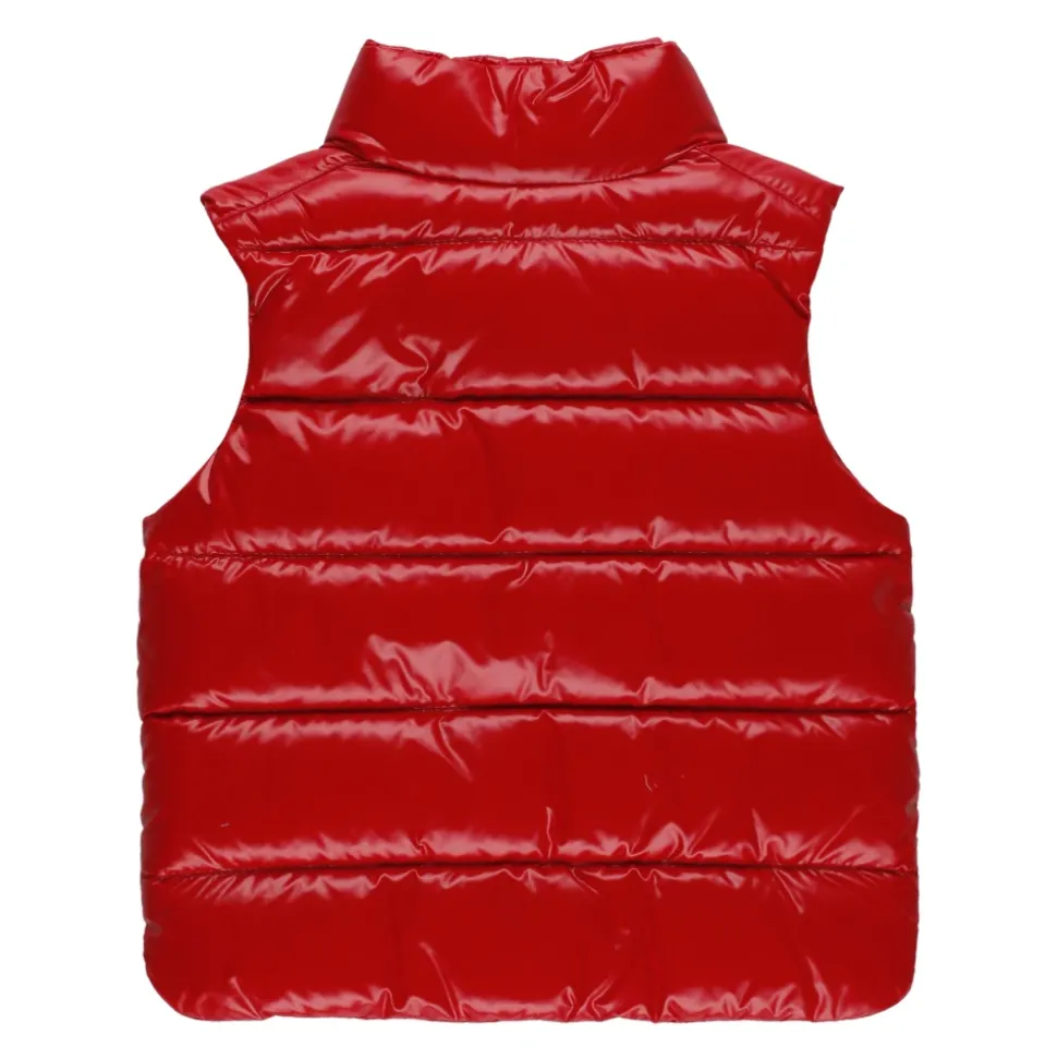 Blijf stijlvol en warm met deze rode Moncler Baby gewatteerde bodywarmer voor meisjes. Met hoge kraag, mouwloos ontwerp, voorzijde in contrasterende kleur iconische patch, twee voorzakken met rits en voorzijde met ritssluiting en drukknopen.