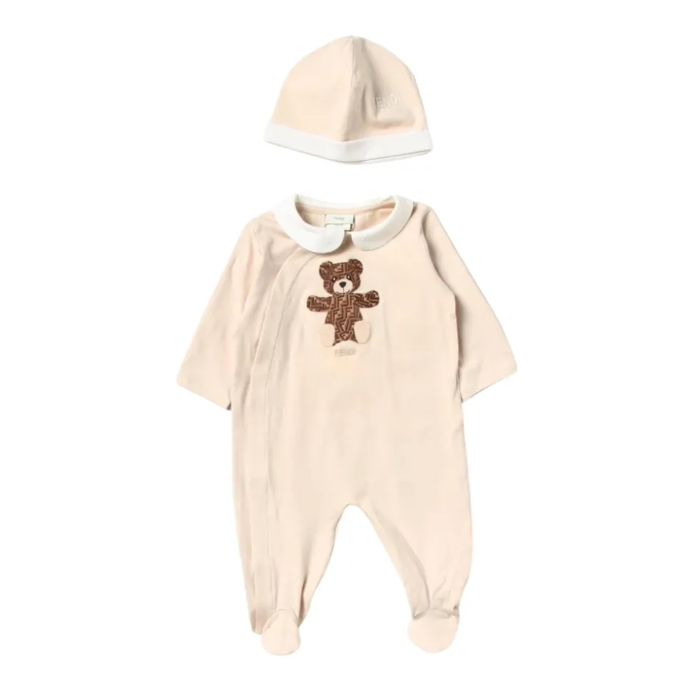 Fendi Romper en Hoed Set met Teddybeer Borduurwerk biedt een comfortabele, stijlvolle outfit met een speels geborduurd motief. De gecoördineerde set is ideaal voor dagelijks gebruik en casual uitstapjes. Belangrijkste kenmerken: Beige | Comfortabel | Tweedelige set (romper en hoed) | Teddybeer borduurwerk | Bijpassende hoed | Romper en hoed set