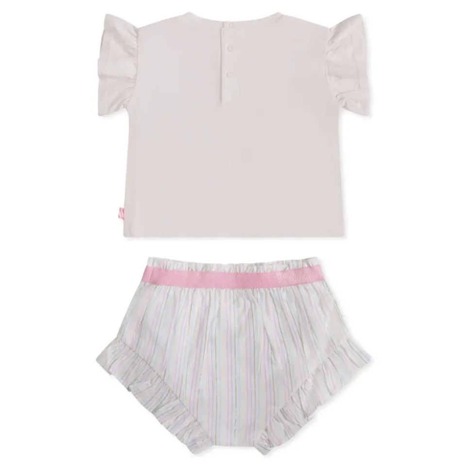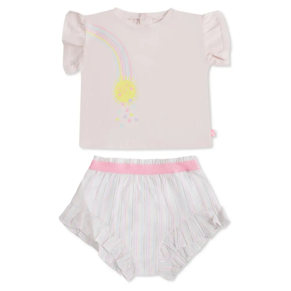 Kleed je kleine meisje in stijl met dit schattige roze pak van Billieblush. De set bestaat uit een korte mouwen t-shirt met ruches, geribbelde ronde hals en een schattige regenboogversiering, samen met shorts met een lurex elastische tailleband en ruches aan de zijkanten. Gemaakt van 100% katoen, is deze outfit zowel comfortabel als modieus. Machinewasbaar op 30°C.