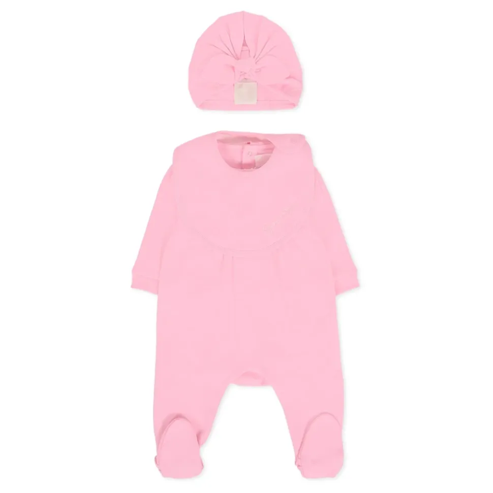 Kleed je kleintje in luxe met deze roze babygrow set van Givenchy Kids. Gemaakt van 100% katoen, de set bevat een babygrow met ruches en geborduurd logo, een muts met een knoop aan de voorkant en logo, en een slab met drukknoopsluiting en logo. Machinewasbaar op 30°C.