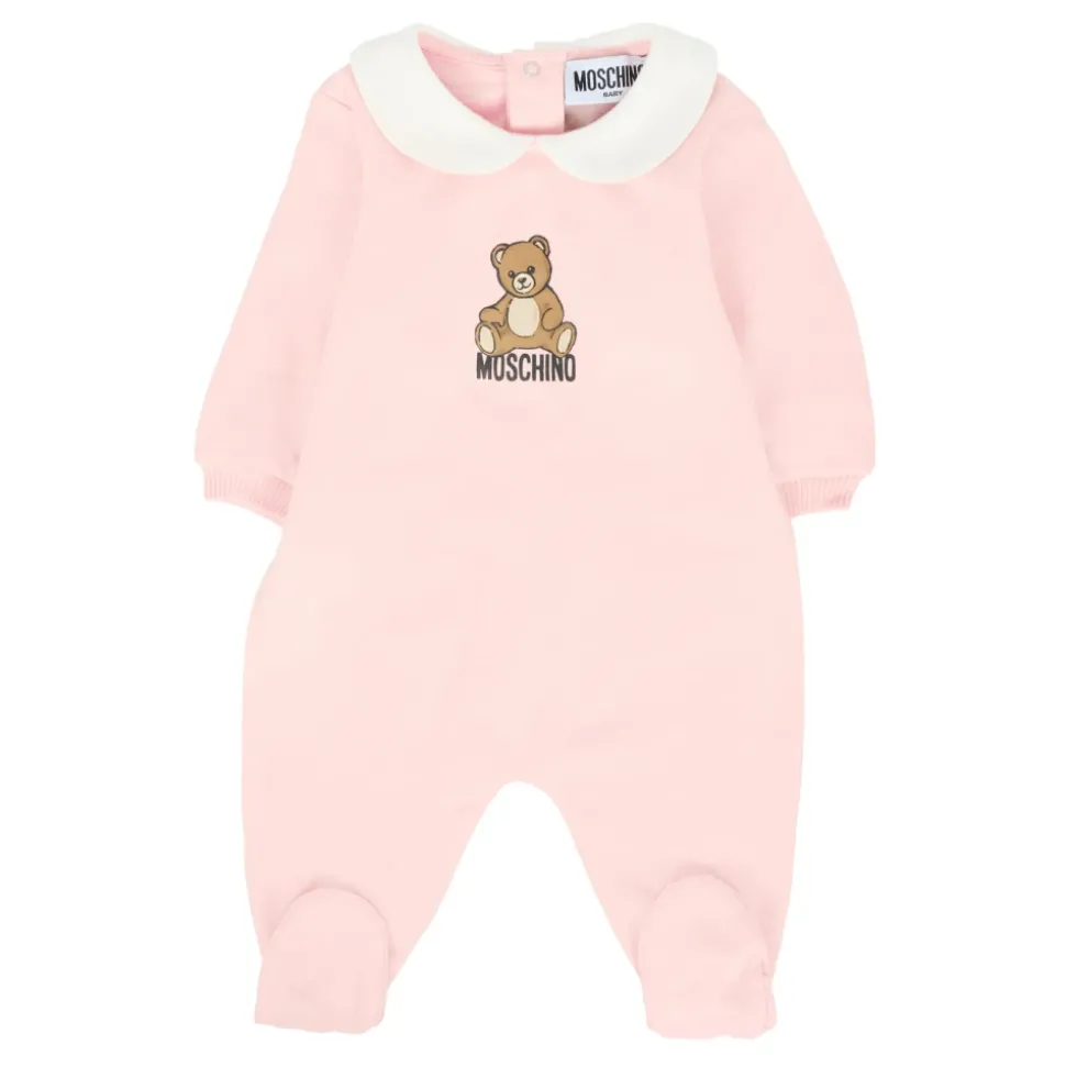 Kleed je kleintje in stijl met deze schattige roze babygrow set van Moschino Kids. Deze set bevat een babygrow, slabbertje en muts, allemaal gemaakt van 100% katoen voor ultiem comfort. De babygrow heeft een schattige witte Peter Pan-kraag, geribbelde manchetten en voetjes, terwijl de muts een omslagkraag heeft en schattige oren aan de zijkanten. Het slabbertje maakt de look compleet met een roze rand en drukknoopsluiting. Afgewerkt met een charmante Teddy Bear-print en logo op de voorkant. Machinewasbaar op 30°C.