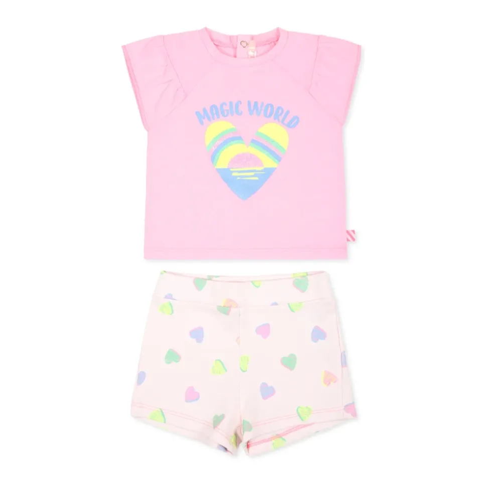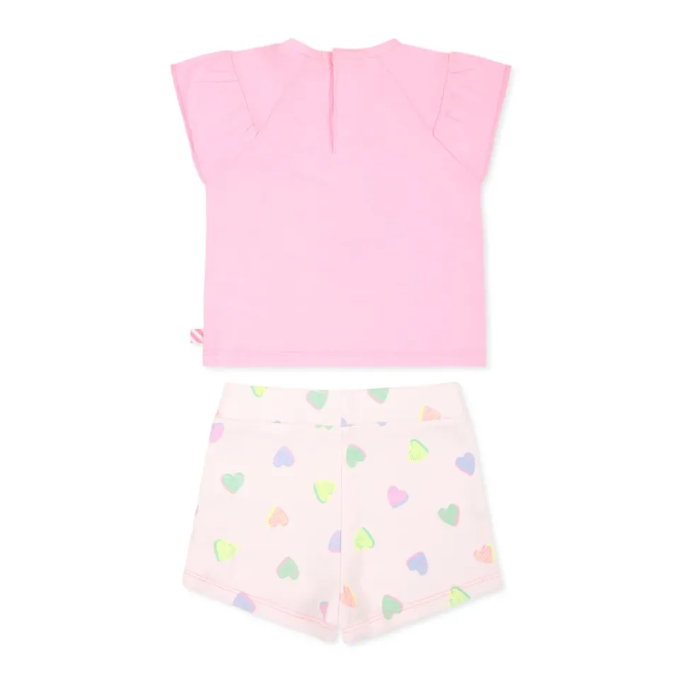 Kleed je kleintje in stijl met dit schattige roze pak van Billieblush. De set bestaat uit een korte mouwen t-shirt met geribbelde ronde hals en automatische knoopsluiting, versierd met lurex schrijven en hartdetails aan de voorkant. Gecombineerd met geborstelde katoenen shorts met elastische taille en allover hartendesign. Gemaakt van 65% polyester en 35% katoen. Machinewas op 30°C.