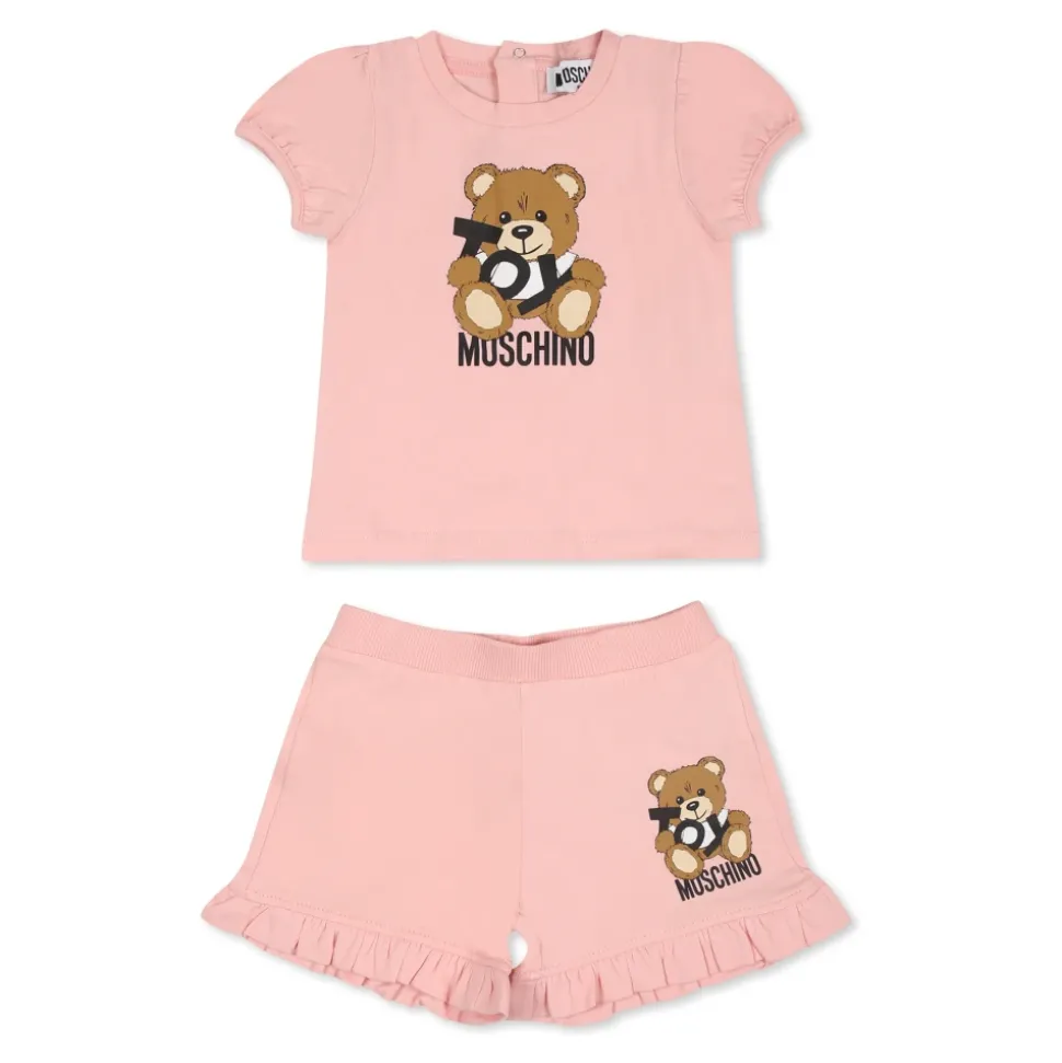 Kleed je kleintje in stijl met dit roze pak van het merk Moschino Kids. Gemaakt van een comfortabele katoenmix, bestaande uit een T-shirt met korte mouwen en pofhals, geribbelde ronde hals en drukknoopsluiting op de achterkant; shorts met elastische taille en gerimpelde zoom. Versierd met Teddy Bear, Toy writing en logo-details op de voorkant. Samenstelling: 95% katoen, 5% elastaan. Machinewas op 30°C.