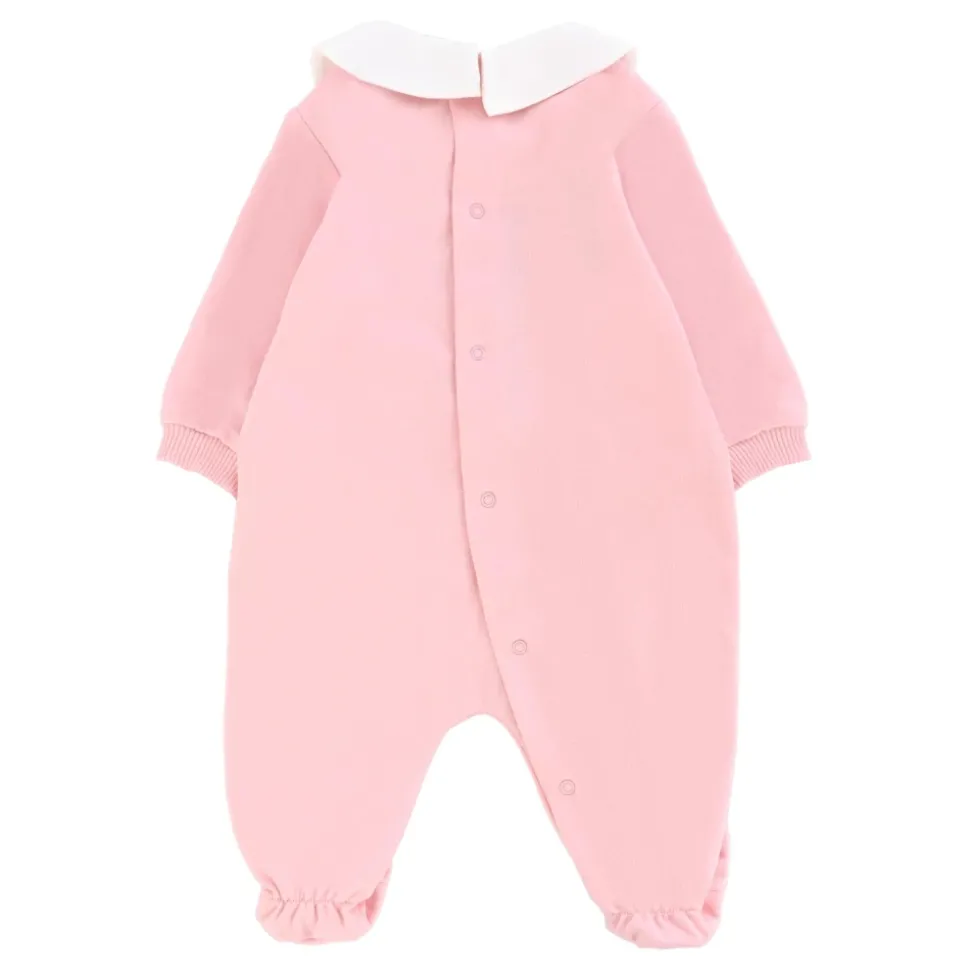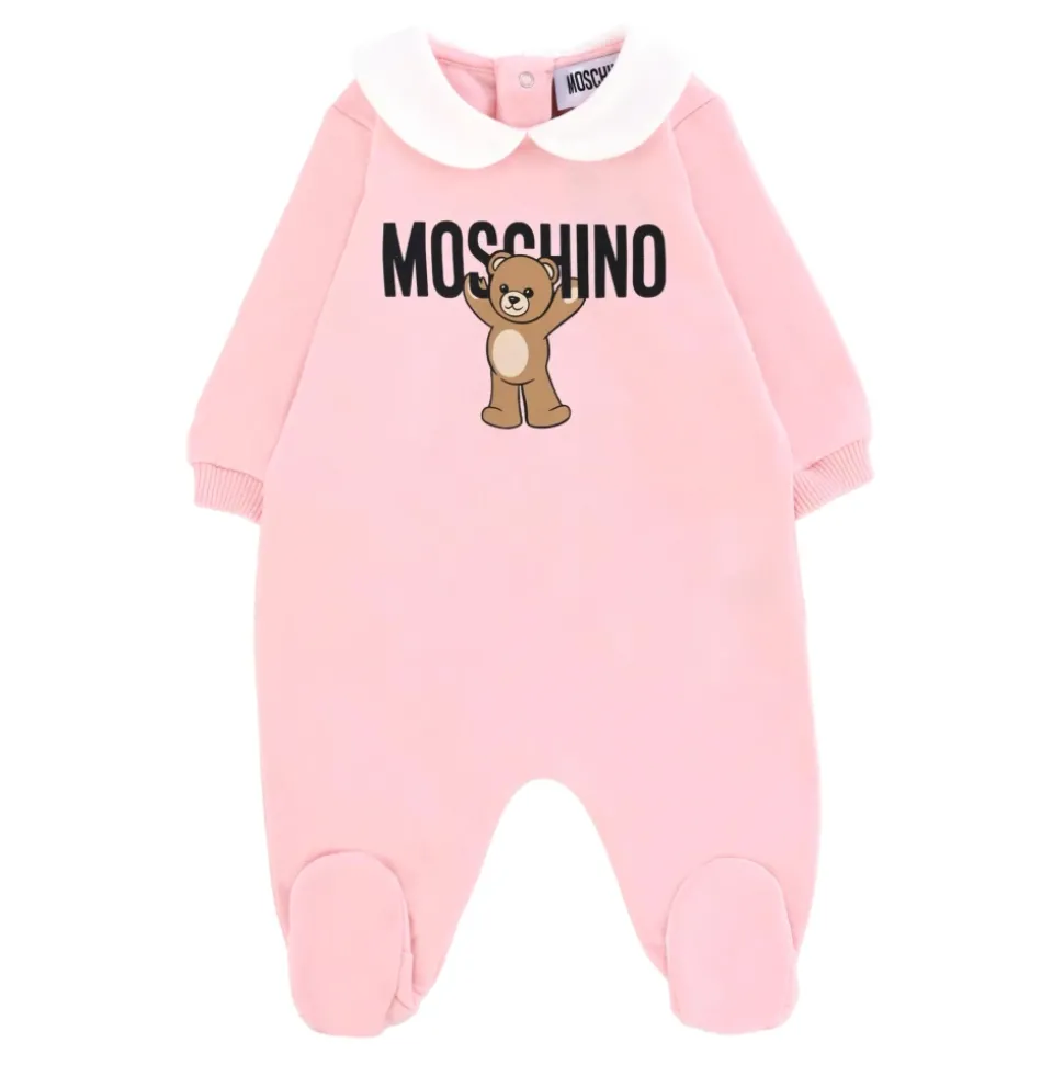 Kleed je kleintje in stijl met deze roze romper van Moschino Kids. Gemaakt van fleece katoen, met lange mouwen, een witte Peter Pan kraag, geribbelde manchetten, voetjes en een drukknoopsluiting op de achterkant. Versierd met een schattige Teddy Bear print en logo op de voorkant. Gemaakt van 100% katoen. Machinewas op 30°C.