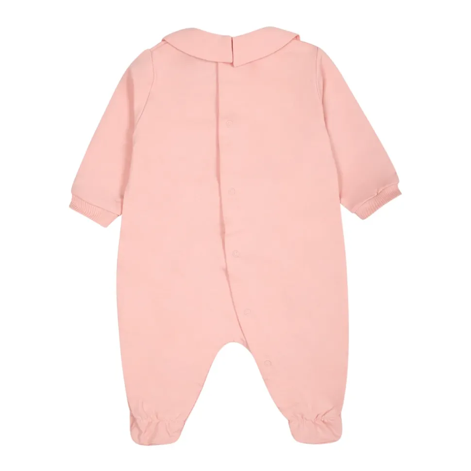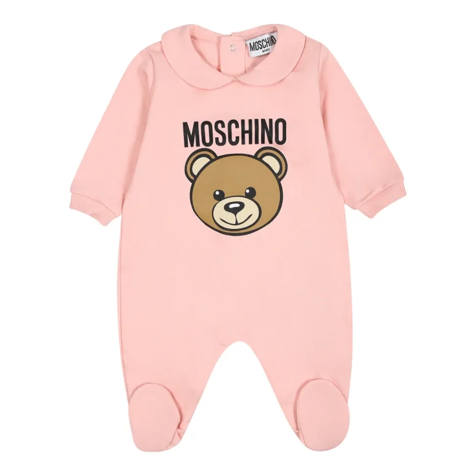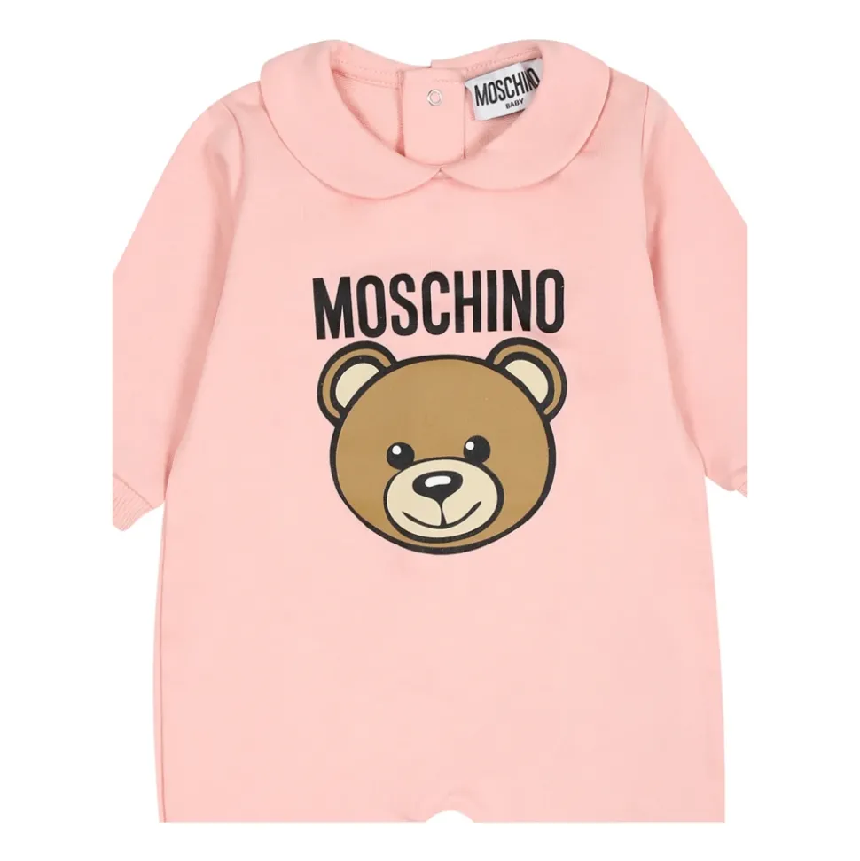 Kleed je kleintje in stijl met deze schattige roze Moschino romper. Gemaakt van 100% katoen, met lange mouwen, een peter pan kraag en een schattige Teddy Bear print aan de voorkant. Makkelijke drukknoopsluiting aan de achterkant. Machinewasbaar op 30°C.