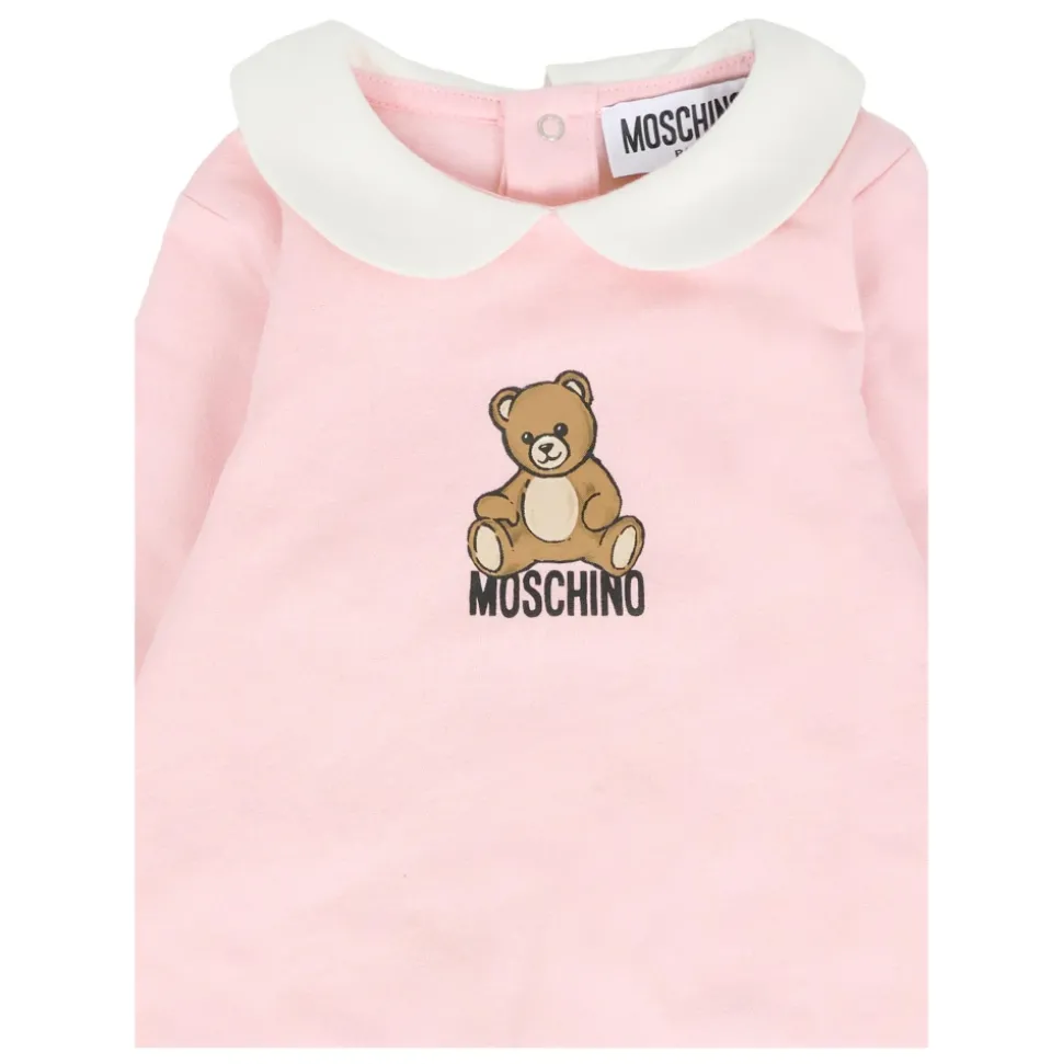 Kleed je kleintje in stijl met deze roze babygrow van Moschino Kids. Gemaakt van fleece katoen, met lange mouwen, een witte Peter Pan kraag, drukknopen op de achterkant, voetjes en geribbelde manchetten. Versierd met een schattige Teddy Beer print en logo op de voorkant. Gemaakt van 100% katoen. Machinewas op 30°C.