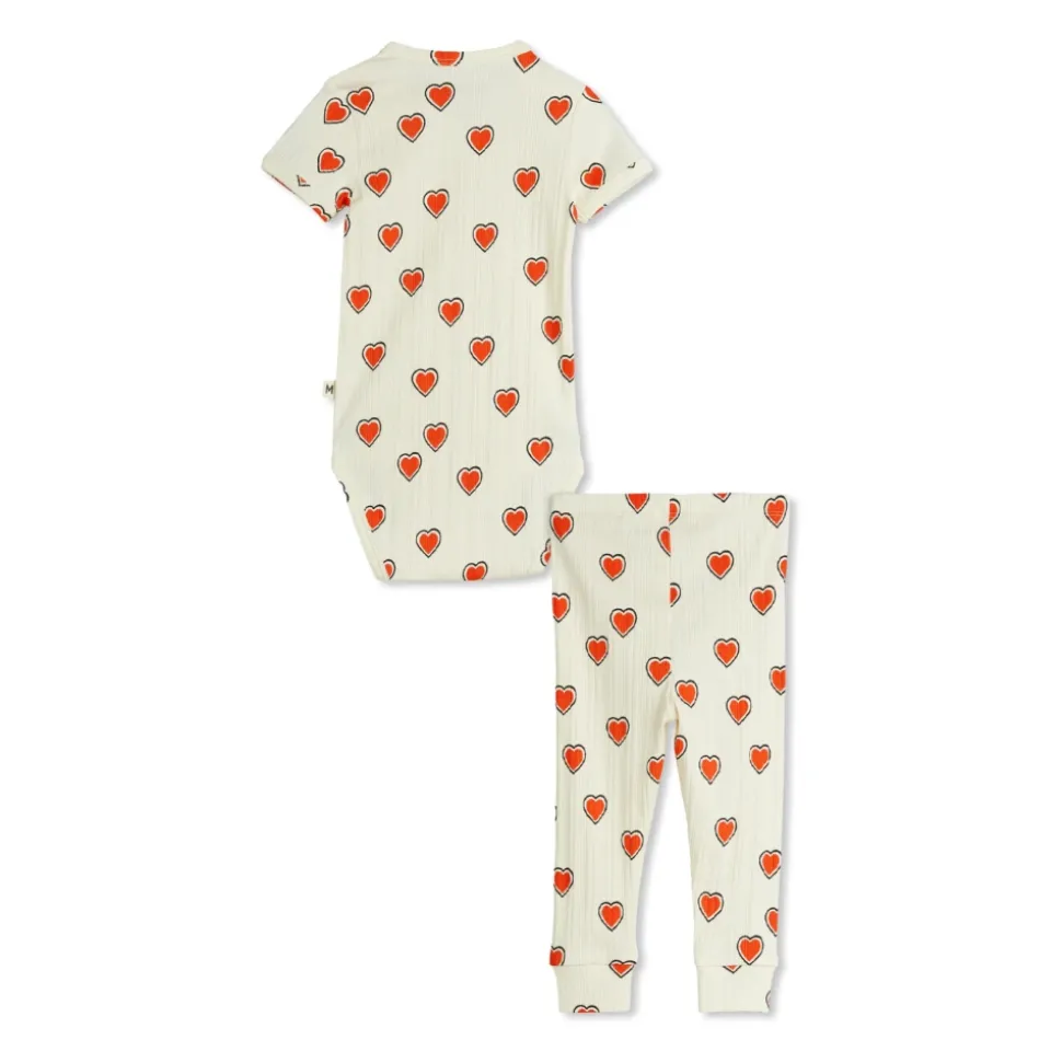 SET: BODYSUIT EN LEGGINGS van Mini Rodini is een verfijnde keuze voor de allerkleinsten, waarbij functionaliteit harmonieus wordt gecombineerd met de charme van jeugdige vrijheid. Het ontwerp omvat een klassieke korte mouw bodysuit en recht gesneden leggings met een elastische manchet aan de enkels, wat zorgt voor comfort en bewegingsvrijheid. De bodysuit is uitgerust met praktische drukknoopsluitingen in het kruis, waardoor snelle luierwissels mogelijk zijn. De delicate, jacquard gebreide stof met een geribbelde textuur omhult zachtjes de gevoelige huid van het kind en biedt zachtheid en elasticiteit voor dagelijks gebruik. Een gedurfd patroon van rode harten met een zwarte omlijning, symmetrisch gerangschikt op beide delen van de set, voegt een uniek karakter toe. Het voortreffelijke vakmanschap en de toewijding aan productie zijn kenmerken van het merk Mini Rodini – een synoniem voor klasse en finesse in kindermode. WAAROM DIT PRODUCT KIEZEN? * Verfijnd ontwerp dat de vreugde en uniekheid van kinderen benadrukt * Natuurlijke, huidvriendelijke materialen * Praktische oplossingen voor gemakkelijker dagelijks onderhoud * Uniek patroon exclusief verkrijgbaar in Mini Rodini-collecties * Geproduceerd met zorg voor het milieu en ethische normen