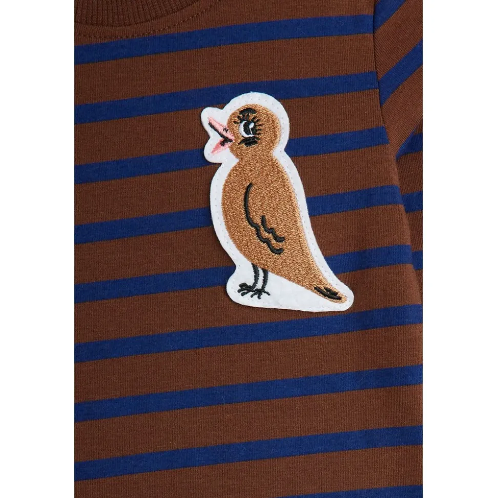 De PANTS AND BODYSUIT SET van Mini Rodini is de belichaming van elegantie en comfort, ontworpen met de jongsten in gedachten. De delicate, hoogwaardige katoenen gebreide stof biedt buitengewone zachtheid om comfort te garanderen voor gevoelige babyhuid, terwijl een vleugje elastaan uitstekende elasticiteit biedt voor dagelijkse activiteiten. De langärmelige bodysuit heeft praktische DRUKKNOPSLUITINGEN aan zowel het kruis als de schouder, waardoor het verschonen gemakkelijk gaat zonder de gevoelige huid van je kleintje te schaden. Een gedurfd, regelmatig patroon van horizontale bruine en marineblauwe strepen geeft de set een moderne maar tijdloze uitstraling. Het zorgvuldig vervaardigde vogelmotief applicatie is een opmerkelijk detail, en het