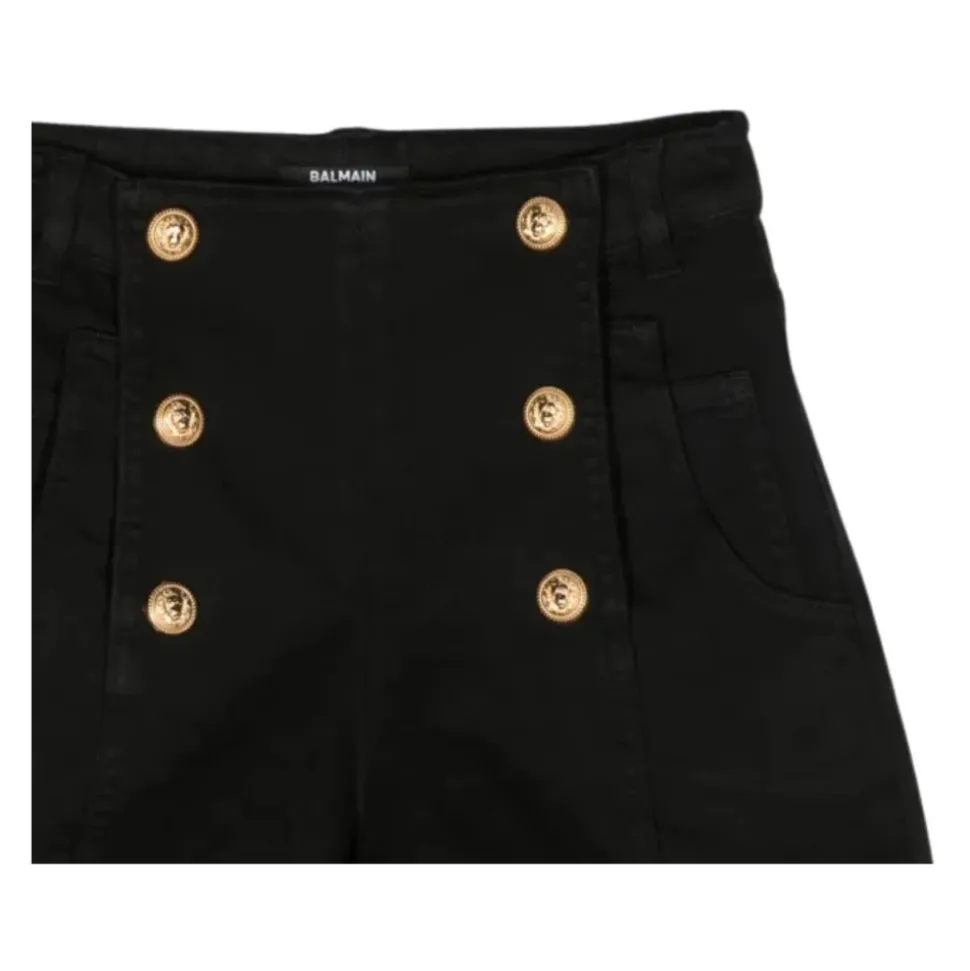 De Balmain shorts met hoge taille combineren een getailleerd silhouet met kenmerkende goudkleurige knopen met reliëf en praktische zakken voor dagelijks gebruik. Belangrijkste kenmerken: Zwart | Nera | Katoen | Drukknoopsluiting aan de zijkant | Twee steekzakken | Twee paspelzakken achter | Goudkleurige knopen met reliëf aan de voorkant | Lengte tot op het bovenbeen | Rechte zoom | Logopatch op de achterkant | Afmetingen en pasvorm: Hoge taille | Lengte tot op het bovenbeen | Samenstelling en onderhoud: 92% katoen | 6% modal | 2% elastaan