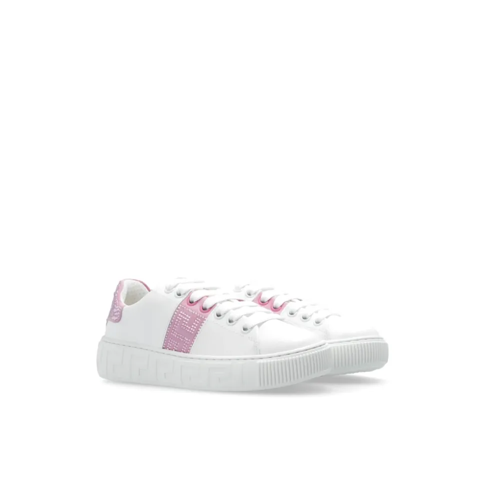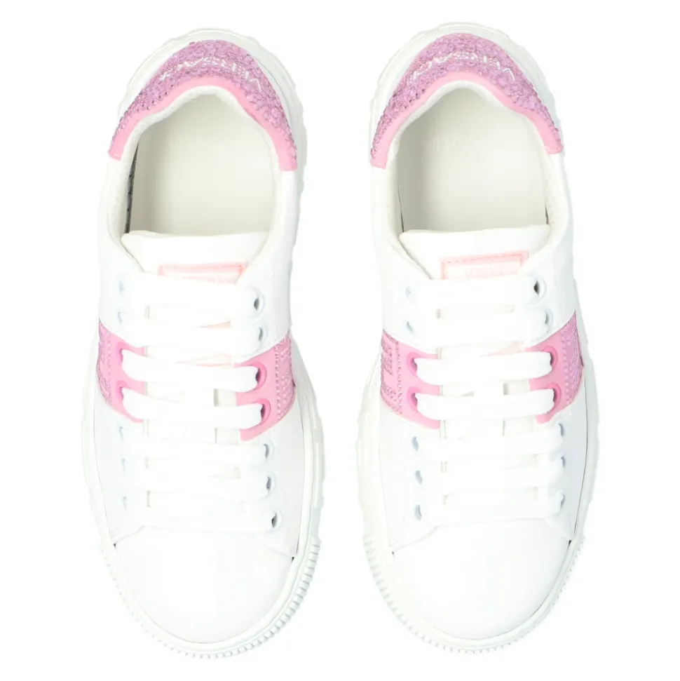 Witte en lichtroze sneakers van Versace Kids. Gemaakt van leer, heeft dit model met vetersluiting een witte rubberen zool en toont een Greca-patroon, het logo van het merk en sprankelende kristallen versieringen.Hoogte van de zool: 2,5 cmHoogte van de zool op het hoogste punt: 3,5 cm