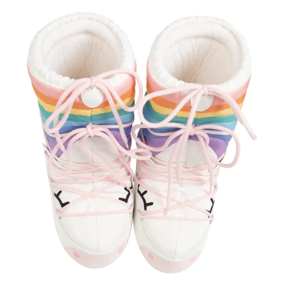 ICON UNICORN SNOW BOOTS van MOON BOOT zijn een synoniem voor elegantie en unieke stijl voor de jongsten. Het uitzonderlijke ontwerp van deze sneeuwlaarzen is geïnspireerd op de magie van eenhoorns, die elke jonge ontdekkingsreiziger zeker zal verrukken. Deze laarzen worden gekenmerkt door een hoge schacht die boven de enkel reikt en ongeëvenaarde bescherming biedt tegen de kou. De stevige constructie met een duidelijk gedefinieerde zool is ideaal voor gebruik in veeleisende winterse omstandigheden. De dominante multicolor met een overwicht van pasteltinten en het regenboogmotief bestaande uit kleurrijke strepen (rood, oranje, geel, groen, blauw, paars) geeft de laarzen een uniek karakter. Roze decoratieve elementen op het voorste deel van de laarzen, die lijken op de neus en ogen van een eenhoorn, voegen charme toe. De sneeuwlaarzen zijn gemaakt van hoogwaardige synthetische materialen, die uitstekende thermische isolatie en waterdichtheid garanderen. De binnenkant van de laarzen is gevoerd met zacht materiaal, wat zorgt voor comfort en warmte. Aan de zijkant van de laarzen staat de inscriptie