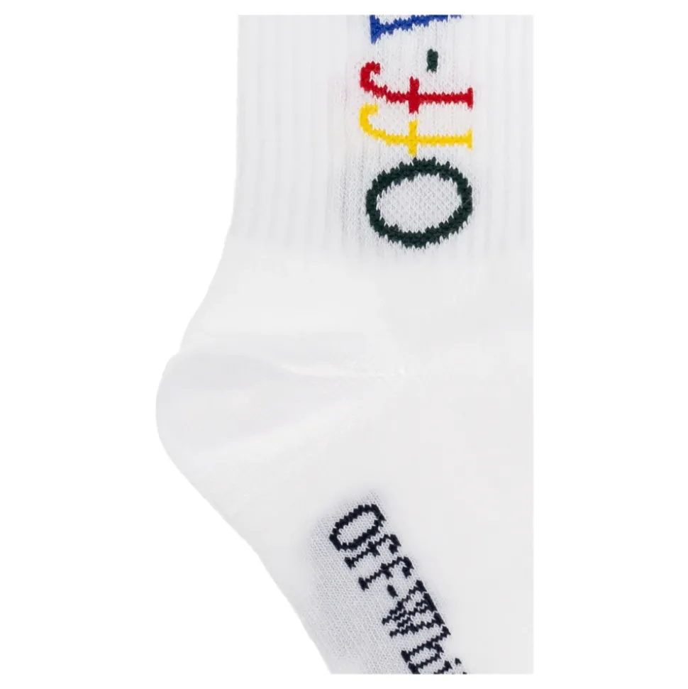 OFF-WHITE™ LOGO SOKKEN zijn een uiting van finesse verborgen in een alledaags detail. Hun klassieke, langere bemanningstijl met duidelijk gemarkeerde hielen en tenen garandeert verfijnd draagcomfort. Het dominante WIT wordt aangevuld met twee horizontale marineblauwe strepen, kenmerkend voor een sportieve esthetiek. De duidelijk geribbelde stof omhult zachtjes de voet en zorgt voor flexibiliteit en een uitstekende pasvorm. De discrete glans van de naam van de maker in de vorm van een verticaal geplaatst “Off-White™” embleem – met elk letter in een andere tint – trekt zeker de aandacht en benadrukt het unieke karakter van het product. Daarnaast is er een horizontale, contrasterende zwarte merkinscriptie op de voet. WAAROM DIT PRODUCT KIEZEN? * Een exclusieve optie voor de jongste designliefhebbers * Onderscheidende geribbelde structuur voor comfort en duurzaamheid * Nauwgezet vervaardigde details en kleur-geaccentueerd logo * Unieke Off-White™ handtekening geïnspireerd door Italiaans ambachtelijk erfgoed * Praktisch gecombineerd met gedurfd, eigentijds ontwerp