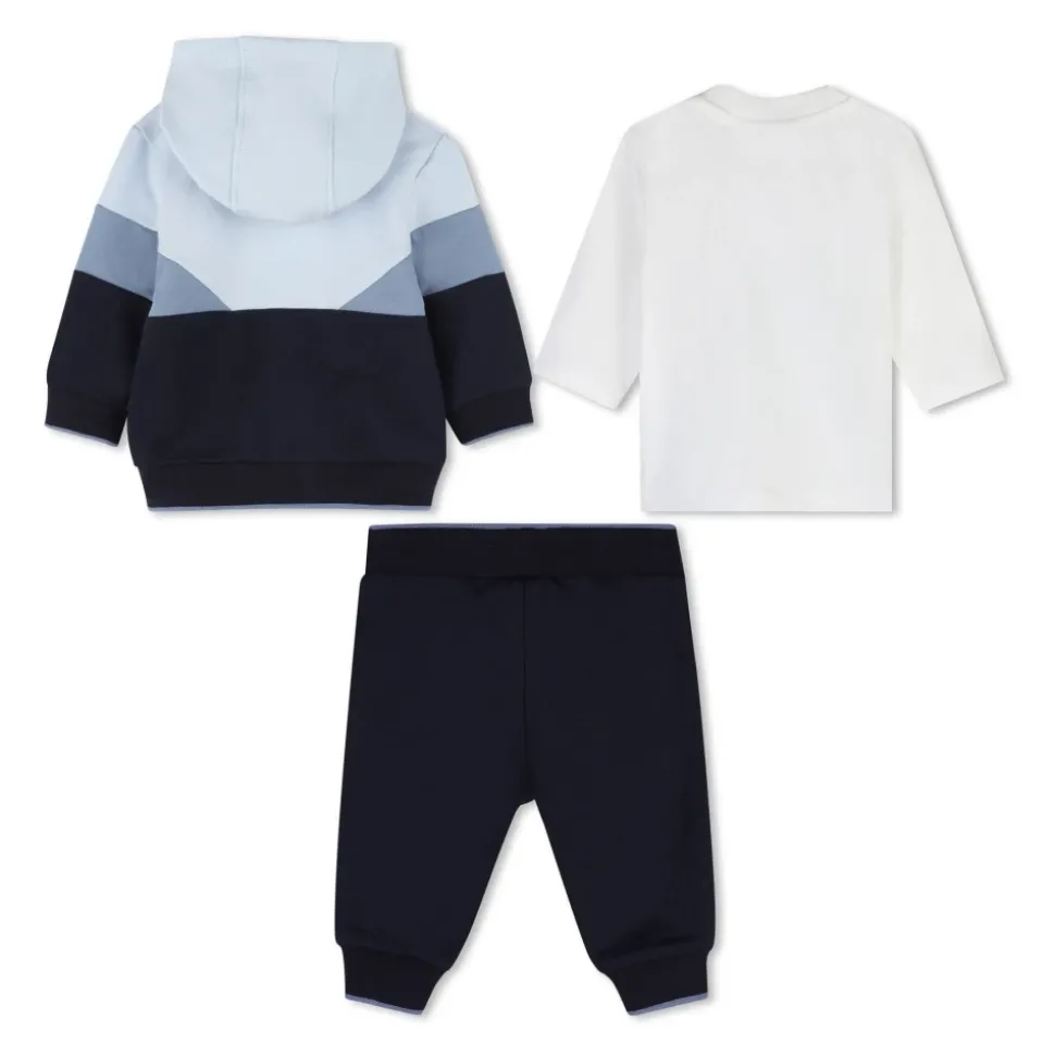 Kleed je kleintje in stijl met deze Sportieve 3-delige kledingset van Hugo Boss. Perfect voor speciale gelegenheden, deze set combineert comfort en elegantie met zijn hoogwaardige materialen en verfijnde details. Belangrijkste kenmerken: Marine | Blauw | 95% Katoen | 5% Elastaan | Ritssluiting | Drukknoopsluiting | Cardigan met capuchon | Geribbelde manchetten | Gedrukt logo | Double B print | Afmetingen en pasvorm: Regular fit | Samenstelling en onderhoud: 95% Katoen | 5% Elastaan | Voering: 96% Katoen | 4% Elastaan | Volg de wasinstructies op het etiket van het kledingstuk.