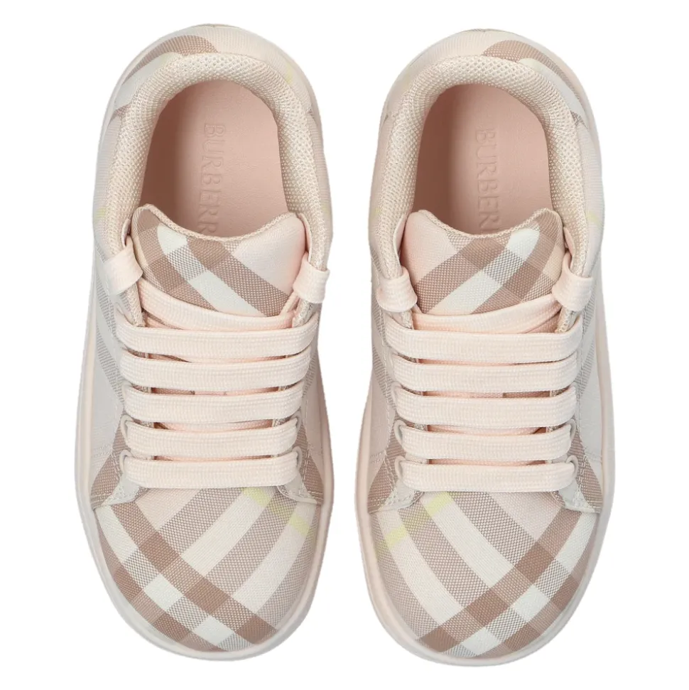 BURBERRY KIDS SNEAKERS belichamen tijdloze elegantie en Britse verfijning binnen een klassieke sneaker-silhouet. De harmonieuze mix van subtiele roze, beige, crème en pastelgeel boeit met zijn voortreffelijke verfijning, terwijl het gedurfde ruitpatroon op het textiel bovenwerk de prestige van het product benadrukt, kenmerkend voor de luxe collecties van Burberry. DE STEVIGE, PLATTE RUBBEREN ZOOL en zorgvuldig afgewerkte interieur zorgen voor ongeëvenaard draagcomfort en duurzaamheid, zelfs bij intensief gebruik. De reliëf