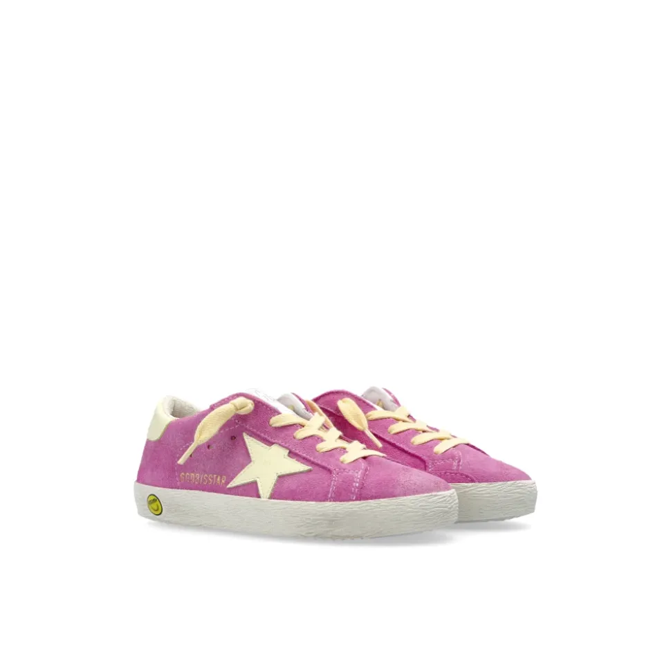 SUPER-STAR CLASSIC MET LIST SNEAKERS van Golden Goose Kids belichamen een onconventionele esthetiek die zowel verrukt met jeugdige lichtheid als tijdloos vakmanschap. Deze sneakers vallen op door hun KLASSIEKE LAAG-BOVEN SILHOUET en een levendige, INTENS ROZE tint, die het unieke karakter van de jonge drager benadrukt. Het bovenwerk is gemaakt van hoogwaardig MATTE-FINISH SUEDE, terwijl het interieur is gevoerd met zacht leer en verfijnde stof, wat zorgt voor dagelijks comfort. Kenmerkende elementen zijn een WITTE STER en elegante gouden merkmarkeringen. Roomkleurige veters, een verfijnde hiel tab en een zool gemaakt van flexibel rubber – wat zorgt voor natuurlijke bewegingsvrijheid – maken het ontwerp compleet. Details zoals een reliëflogo, zorgvuldig verouderde afwerking en de iconische Golden Goose motieven creëren een uniek product dat traditioneel vakmanschap combineert met gedurfde, stedelijke stijl. WAAROM DIT PRODUCT KIEZEN? * Edel materialen die duurzaamheid en comfort bieden * Unieke, herkenbare Golden Goose esthetiek * Zorgvuldig vervaardigde versieringen en de cultus witte ster * Luxueus karakter en dagelijks draagcomfort Zoolhoogte: 2 cm Zoolhoogte op het hoogste punt: 2 cm Klanten hebben gemeld dat dit merk groot uitvalt. We raden aan om één maat kleiner te kiezen dan je gebruikelijke maat.