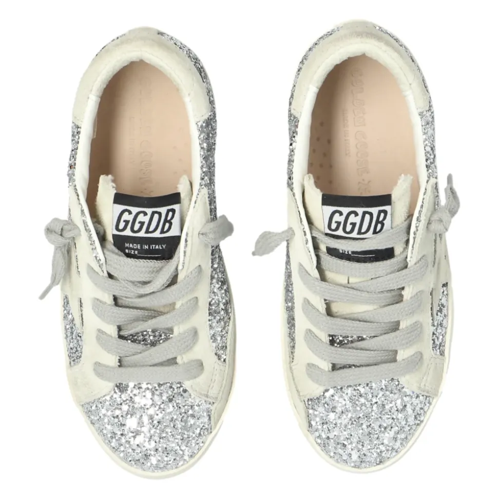 Golden Goose Super-Star Young sneakers combineren een klassiek silhouet met een zilverkleurige glitter bovenkant en grijze suède details voor een opvallende maar draagbare look. Belangrijkste kenmerken: Grijs | Zilver | Leer, textiel, synthetisch | Flexibele rubberen zool | Leren en textiele voering | Laag silhouet | Afgeronde neus | Zilverkleurige glitter bovenkant | Grijs suède stermotief en hiellus | Zwart logo op de tong | Gouden “GOLDEN GOOSE” print op de hiellus | Vintage afwerking | Handgemaakte details | Afmetingen & pasvorm: Zoolhoogte: 2 cm | Zoolhoogte op het hoogste punt: 2,5 cm | Samenstelling & verzorging: Bovenkant: 29% polyethyleen, 25% polyurethaan, 24% rundleer, 11% katoen, 11% viscose | Voering: 60% rundleer, 40% katoen | Zool: 100% rubber