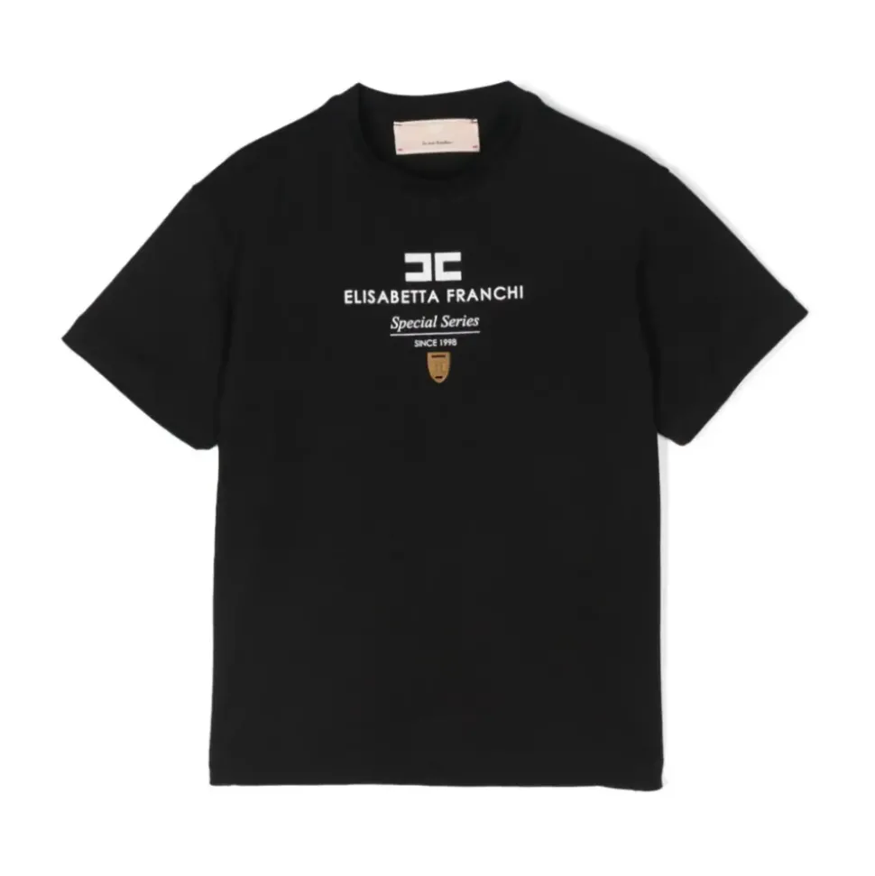 Geef je stijl een boost met de Elisabetta Franchi T-shirt met logo-print en korte mouwen, met een opvallende mesh-textuur en een elegante goudkleurige logo-plaque. Belangrijkste kenmerken: Zwart | 94% Katoen | 6% Elastaan | Ronde hals | Korte mouwen | Rechte en ongevoerde zoom | Samenstelling en onderhoud: 94% Katoen | 6% Elastaan | Machinewas koud, droogtrommel laag. De modellen van Elisabetta Franchi zijn over het algemeen nauwsluitend ontworpen. Als je tussen twee maten in zit, raden wij je aan een maat groter te nemen.