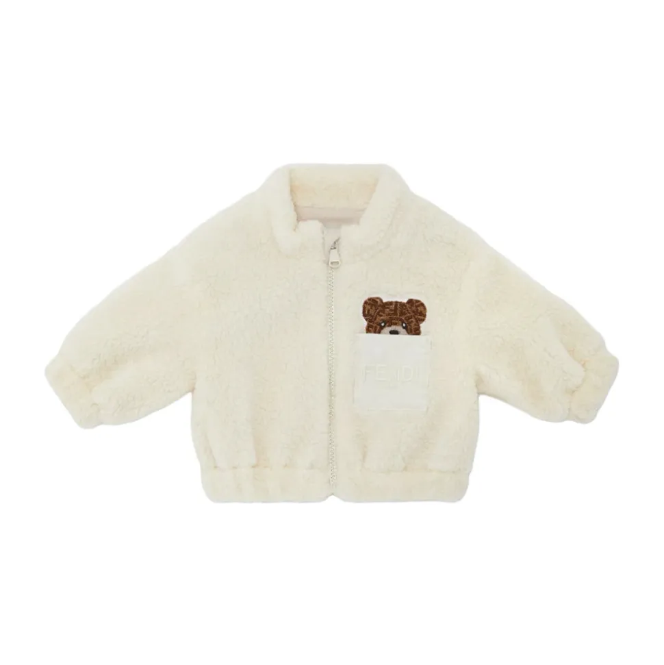 Kleed je kleintje in stijl met de Fendi Teddy Texture Baby Fleece Jas, met een zachte ecru teddytextuur en elegante ton-sur-ton Fendi Roma-borduursel. Belangrijkste kenmerken: Wit | Fleece | Hoge kraag | Geborduurde beer op de voorzak | Ton-sur-ton Fendi Roma-borduursel |