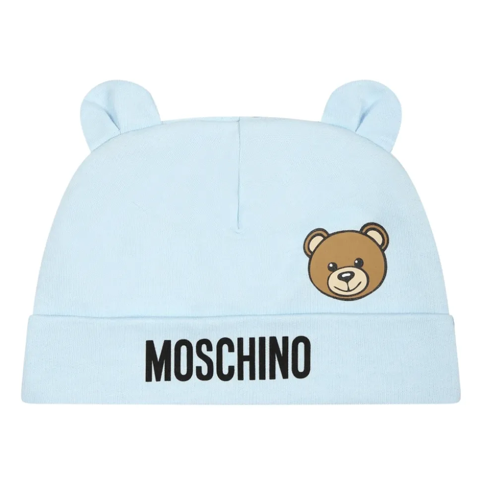 Kleed je kleintje in stijl met deze schattige Moschino kinderset in lichtblauw. De set bevat een katoenen muts met schattige oren en een bijpassende slab, beide met een Teddy Bear-print en zwart logo. Gemaakt van 100% katoen. Wasinstructies: Machinewas op 30°C.