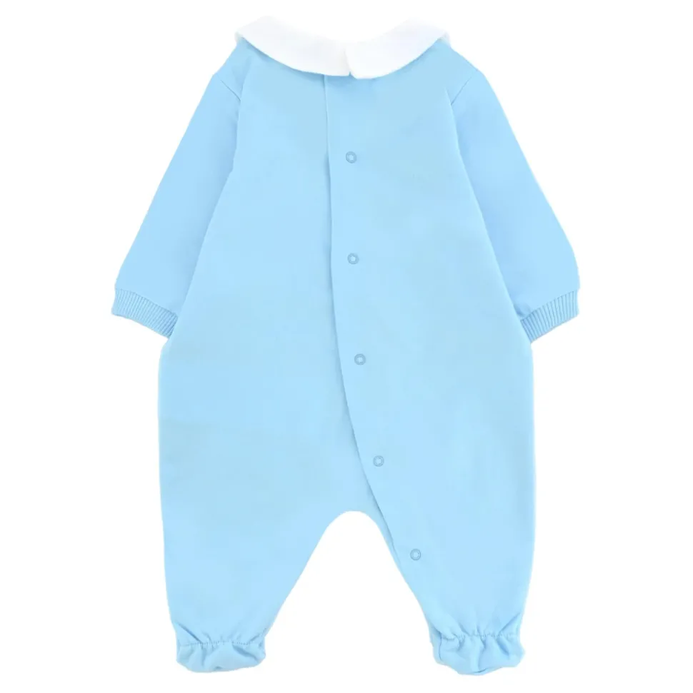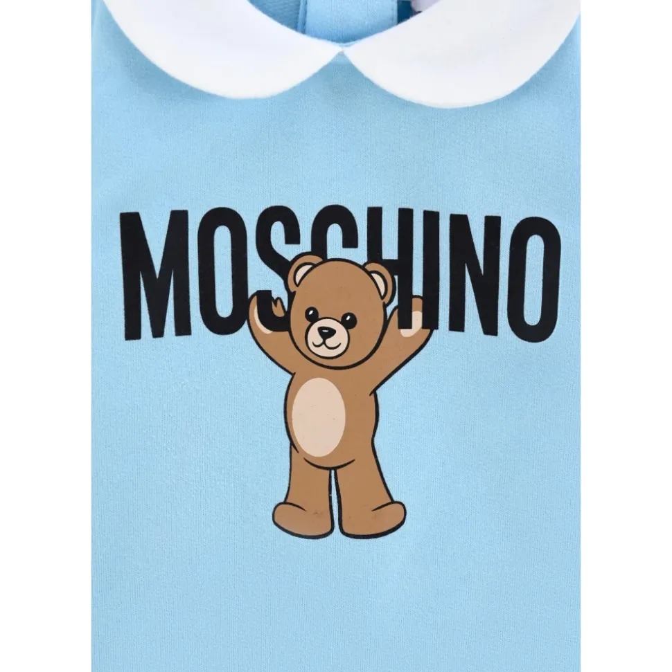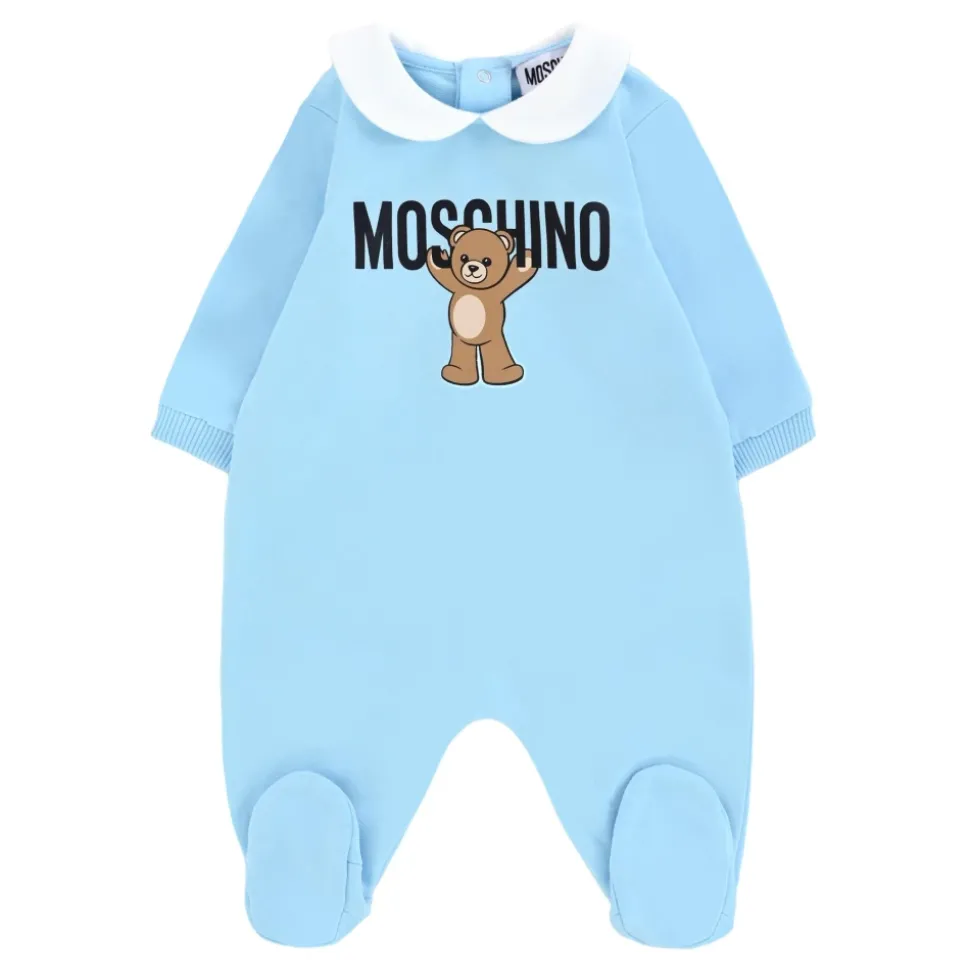 Kleed je kleintje in stijl met deze lichtblauwe babygrow van Moschino Kids. Gemaakt van fleece katoen, met lange mouwen, een witte Peter Pan kraag, geribbelde manchetten, voetjes en een drukknoopsluiting aan de achterkant. Versierd met een schattige Teddy Bear print en logo op de voorkant. Gemaakt van 100% katoen. Machinewas op 30°C.