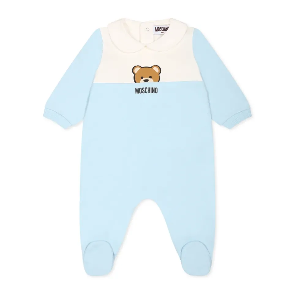 Kleed je kleintje in stijl met deze lichtblauwe babygrow van Moschino Kids. Gemaakt van geborsteld katoen, met lange mouwen, een peter pan kraag, voetjes, drukknoopsluiting op de rug en tussen de benen, geribbelde manchetten en voetjes. Versierd met Teddy Bear en logo op de voorkant. Gemaakt van 100% katoen. Machinewas op 30°C.
