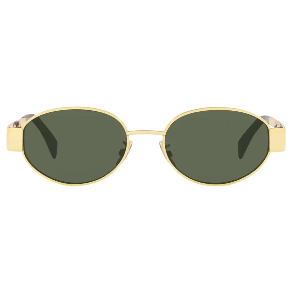 Upgrade je stijl met deze Celine ‘Triomphe 01’ zonnebril met een goudkleurig metalen frame en ovale groen getinte glazen. Biedt bescherming tegen UVA en UVB-stralen. Voorzien van het iconische Triomphe-logo op de pootjes. Lensbreedte: 54 mm; Neusbruglengte: 18 mm; Pootjeslengte: 135 mm. Gemaakt van metaal.
