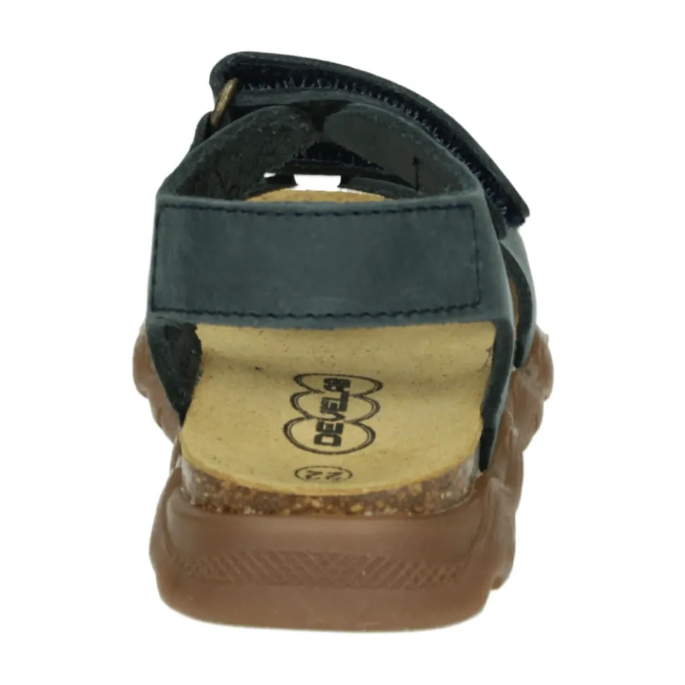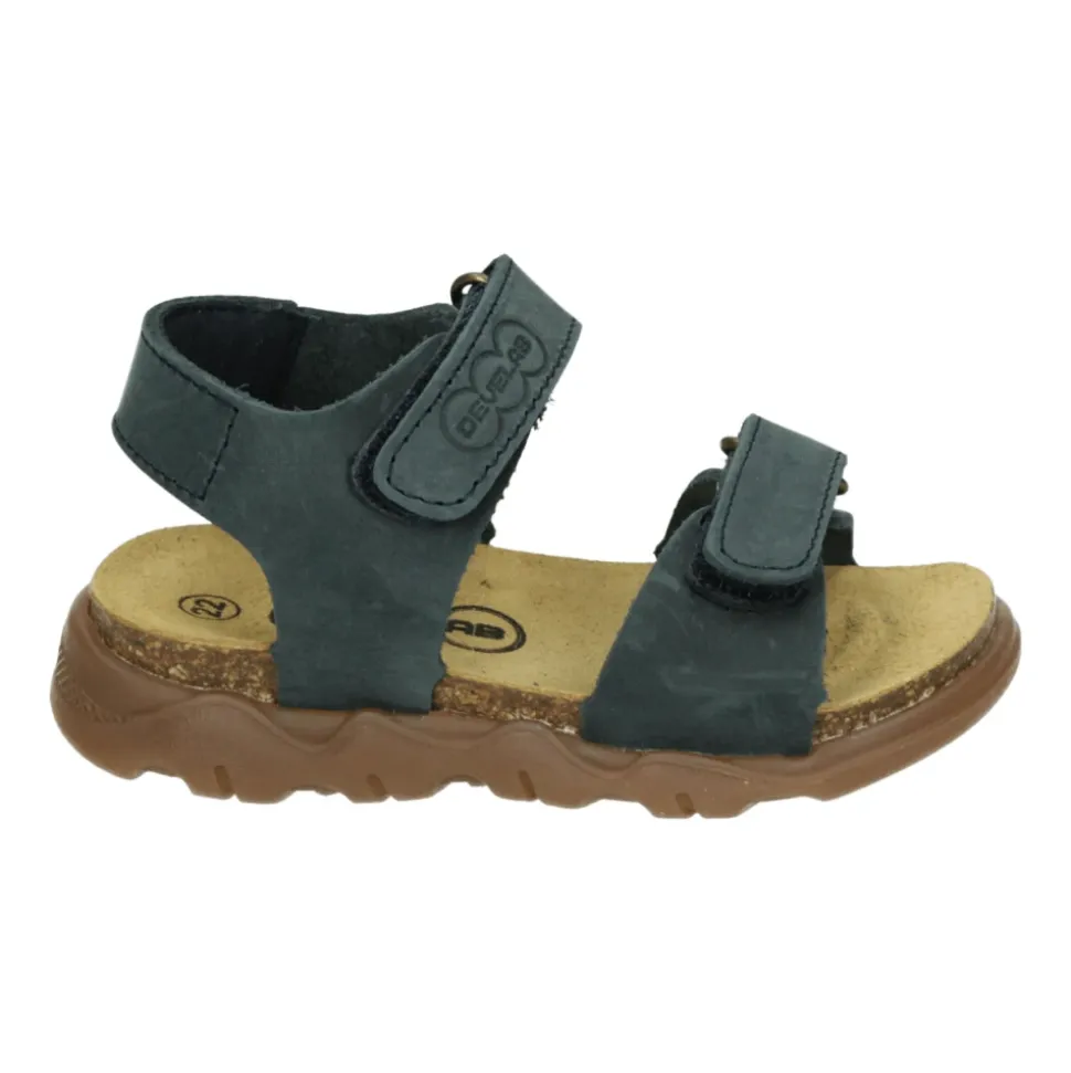 Ontdek de comfortabele Develab voetbedsandaal voor jongens in het blauw. Modelnaam 48399 met verstelbare banden, gemaakt van gevet leren bovenmateriaal en een rubberen zool. Breedte 3 en vast voetbed voor de hele dag ondersteuning.