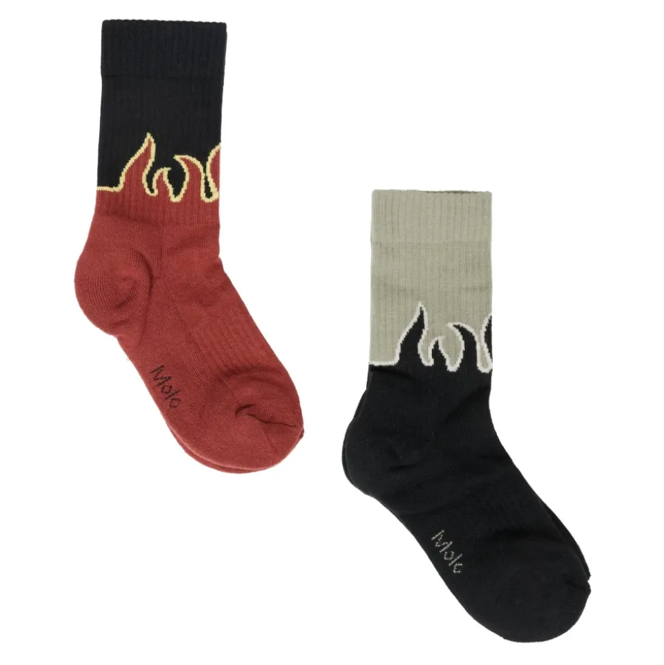 Kleed je kleintje in stijl met deze Molo kinder zwart sokkenset. De set bevat twee paar sokken met een combinatie van zwart en bordeauxrood, en zwart en groen met vlammen. Gemaakt van 80% katoen, 17% polyamide en 3% elastaan, deze sokken zijn zowel comfortabel als stijlvol. Machinewasbaar op 40°C.