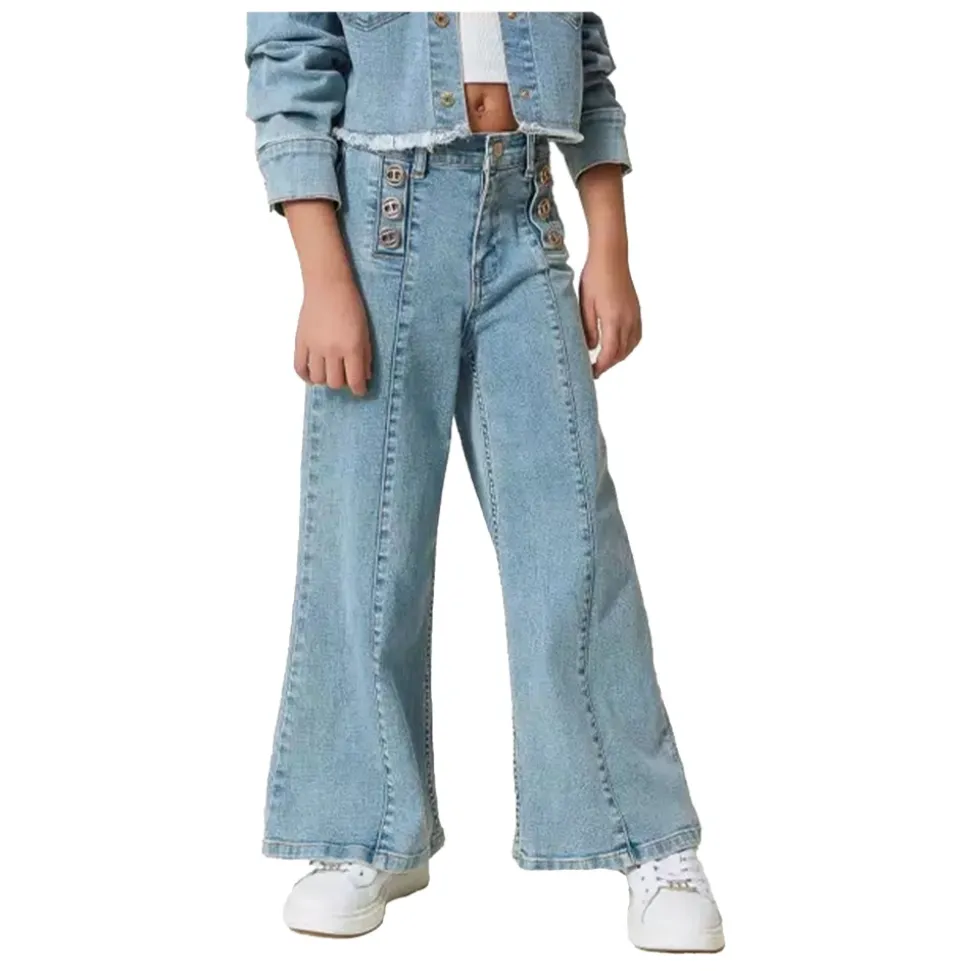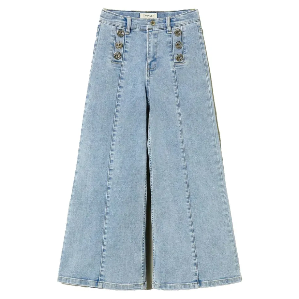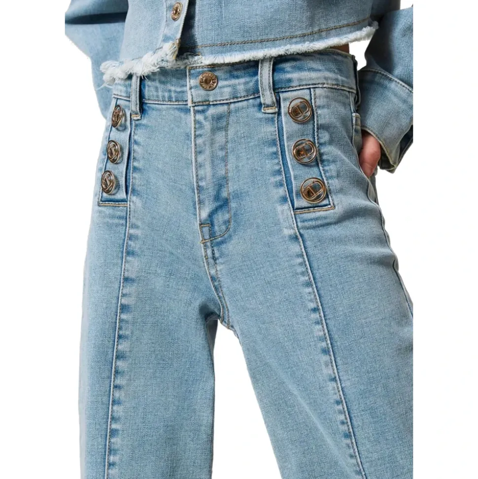 De Twinset wide leg jeans met logoknopen combineert een verfijnd silhouet met wijde pijpen met decoratieve logoknopen en verticale naden voor een stijlvolle alledaagse look. Belangrijkste kenmerken: Blauw | Blu | Katoen | Stretch voor bewegingsvrijheid | Ritssluiting en knoopsluiting | Wijde pijpen | Verticale naden aan de voorkant | Decoratieve ovale T-knopen | Afmetingen & pasvorm: Lengte model: 128 cm (maat 8) | Wijde pasvorm | Comfortabele taille | Samenstelling & verzorging: 72% Katoen | 23% Polyester | 3% Viscose | 2% Elastane | Machinewas max. 30°C (mild programma); niet bleken; niet in de droogtrommel; niet chemisch reinigen; strijken op max. 110°C (stoom vermijden); hangend laten drogen in de schaduw; gebruik een wasmiddel zonder bleekmiddel.