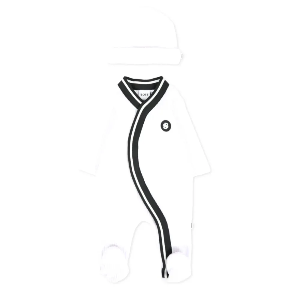 Kleed je kleintje in stijl met deze Hugo witte chenille babygrow en hoed set. De set bevat een lange mouw onesie met drukknoopsluiting, witte details en voetjes, versierd met een rubberen logopatch op de borst. Maak de look compleet met de omgeslagen hoed. Gemaakt van 70% katoen, 28% polyester en 2% elastaan. Machinewas op 30°C.