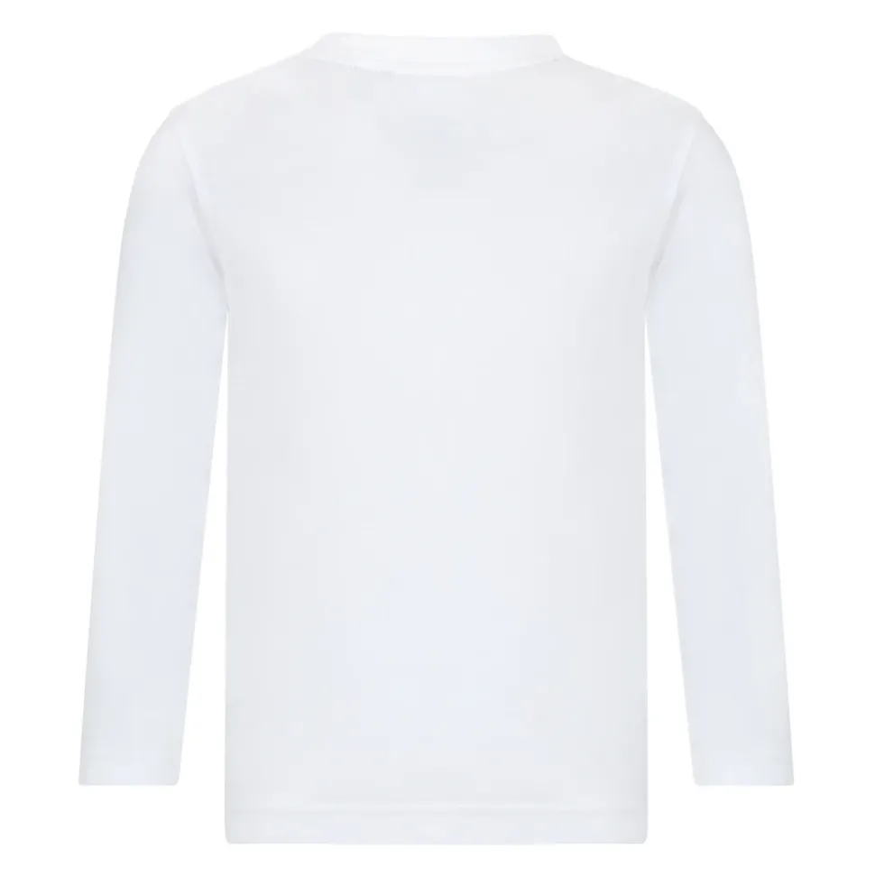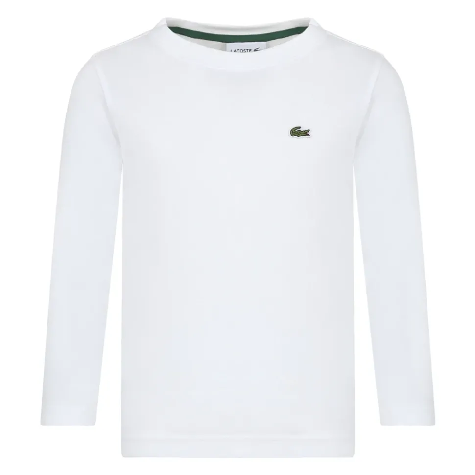 Lacoste wit katoenen T-shirt voor jongens, met lange mouwen, ronde hals en iconische krokodilborduursel op de borst. Gemaakt van 100% katoen. Machinewasbaar op 30°C.