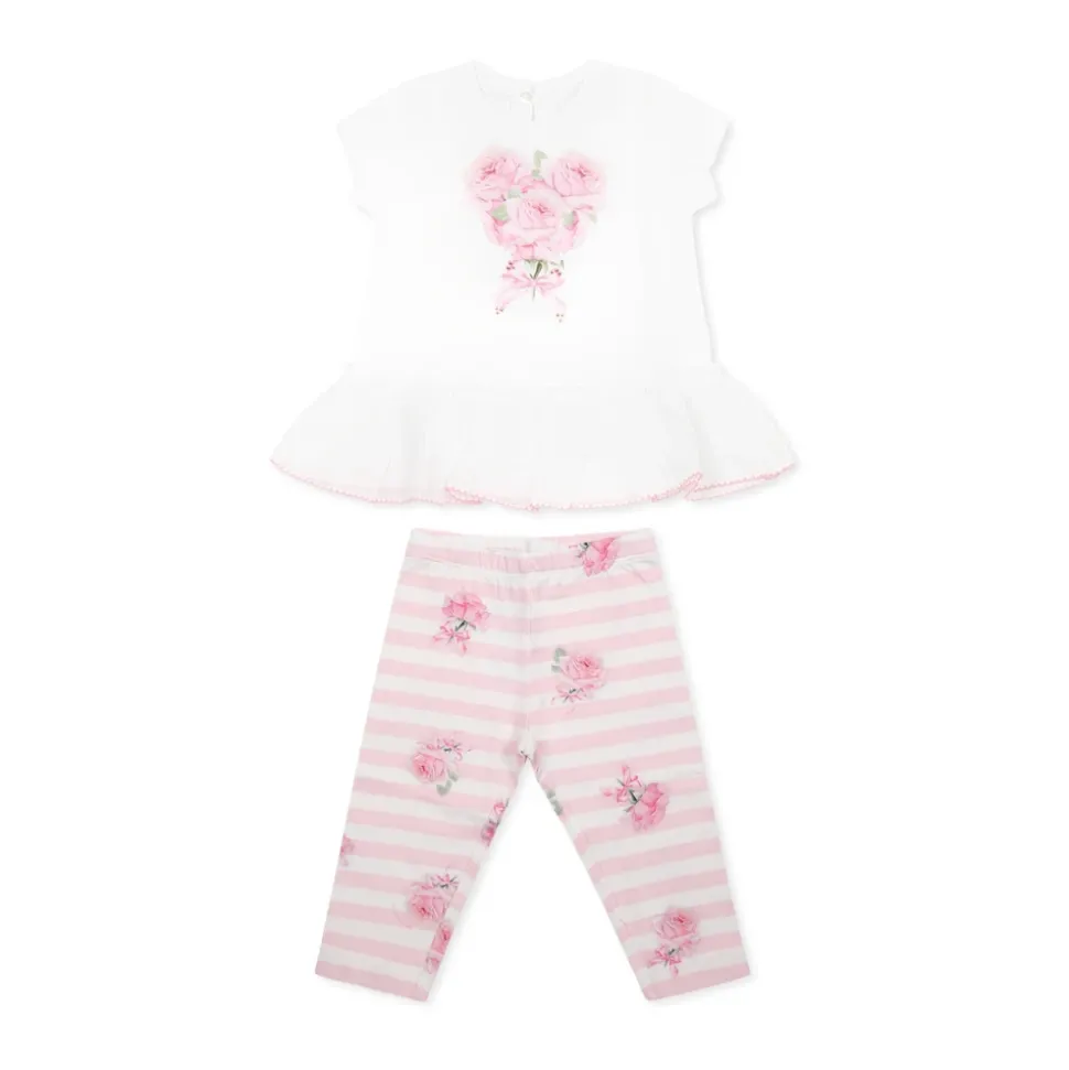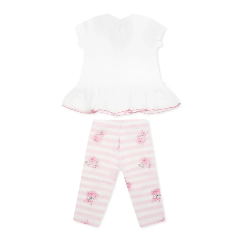 Kleed je kleine meisje in stijl met deze Monnalisa witte pak set. De set bevat een korte mouwen t-shirt met een geribbelde ronde hals, knoopsluiting en een ruche aan de onderkant, versierd met een prachtige rozenprint. De roze gestreepte leggings hebben een elastische taille en een allover rozenontwerp. Gemaakt in Italië van 100% katoen. Machinewasbaar op 30°C.