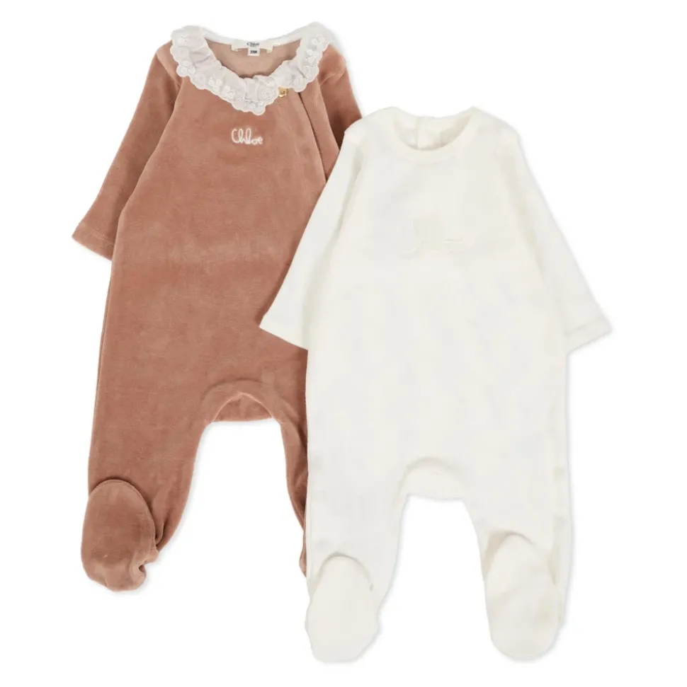 Kleed je kleintje in stijl met deze Chloé witte babygrow set. Deze set bevat twee babygrows, één in het wit en één in het bruin. De witte babygrow heeft lange mouwen, een ronde hals, drukknopen op de rug en voetjes, versierd met een geborduurd logo op de voorkant. De bruine chenille babygrow heeft lange mouwen, een ronde hals, ruches met geborduurde bloemen rond de hals, drukknopen aan de voorkant en voetjes, ook versierd met een geborduurd logo. Gemaakt van 100% katoen. Machinewasbaar op 30°C.