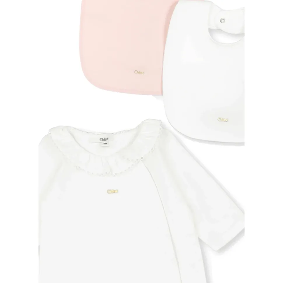 Kleed je kleintje in stijl met deze witte babygrow set van Chloé Kids. Gemaakt van 100% katoen, inclusief een babygrow met lange mouwen en twee slabbers, perfect voor comfort en gemak. Belangrijkste kenmerken: Wit | Roze | 100% Katoen | Drukknoopsluiting | Inclusief voetjes | Geborduurde kraag | Goudkleurig logo op de voorkant | Samenstelling en onderhoud: 100% Katoen | Machinewasbaar op 30°C