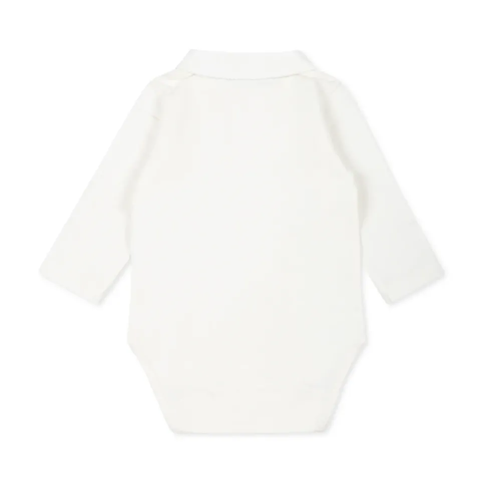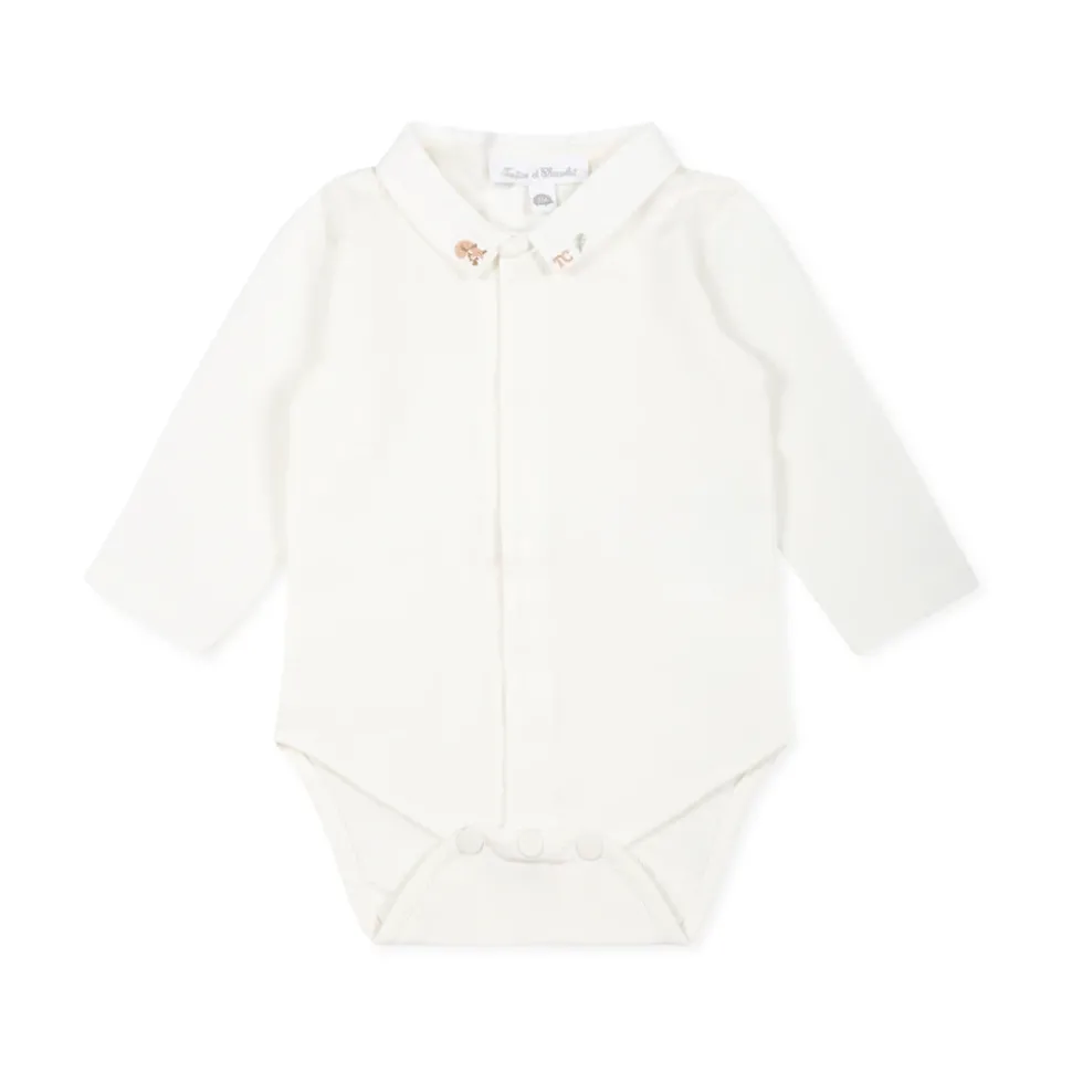 Kleed je kleintje in stijl met deze witte body van Tartine et Chocolat. Met lange mouwen, een puntkraag en automatische knoopsluiting aan de voorkant en tussen de benen is deze 100% katoenen body zowel comfortabel als chique. Machinewasbaar op 30°C.