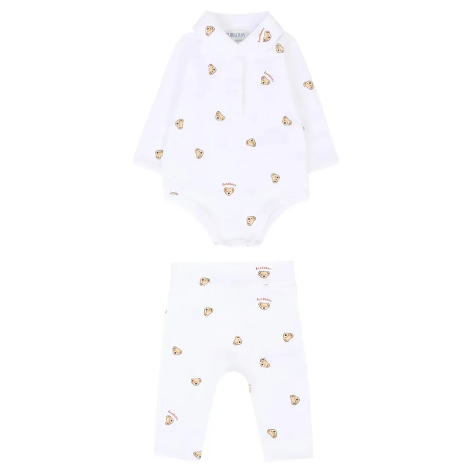 Kleed je kleintje in stijl met deze witte set van het luxe merk Burberry Kids. Gemaakt van zacht stretchkatoen, bestaande uit een lange mouwen body met Peter Pan kraag en drukknoopsluiting, samen met bijpassende broek versierd met de iconische Thomas beer en logo. Gemaakt van 96% katoen en 4% elastaan. Machinewasbaar op 30°C.