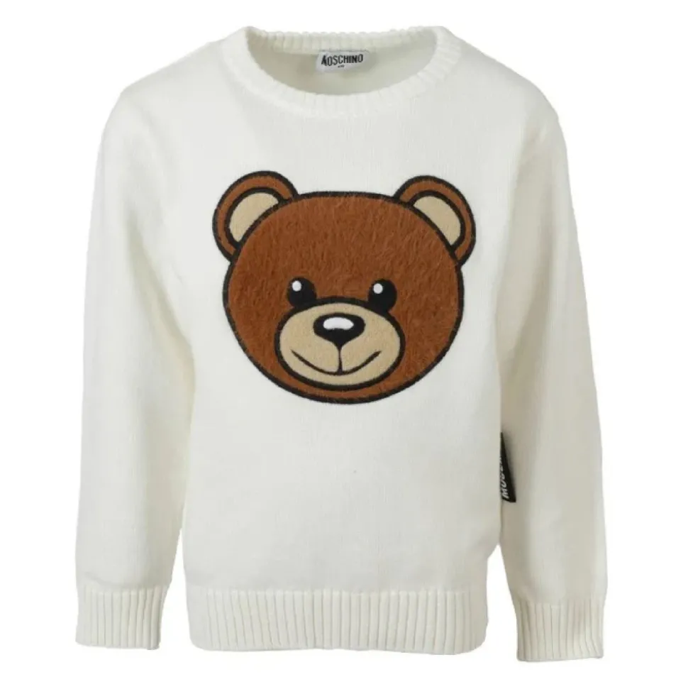 Blijf stijlvol en gezellig met deze witte gebreide trui van Moschino, perfect voor kinderen. Shop nu!